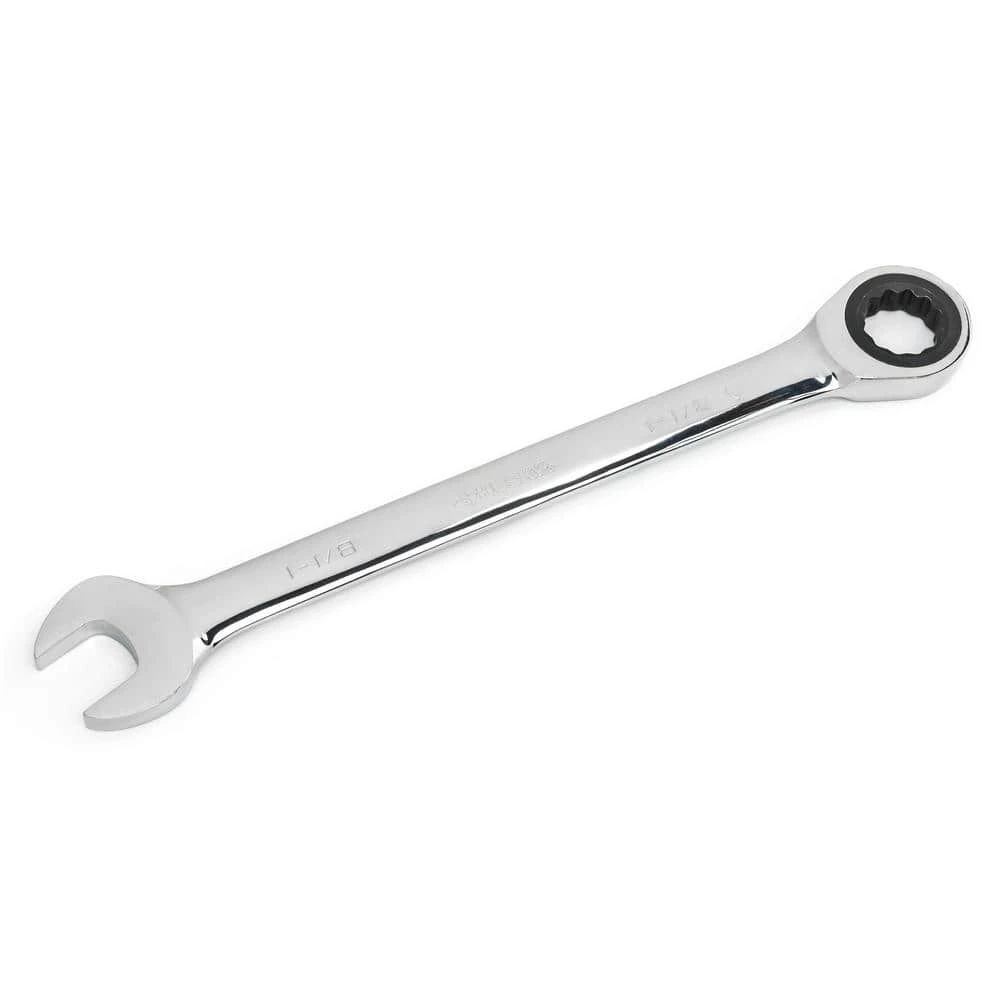 Husky’s ratcheting combination wrenches feature a 12-point, 72-tooth ratcheting box end that needs only 5° to engage fasteners. Each wrench is manufactured from chrome alloy steel and heat treated for added strength and wear protection; providing durability for a lifetime of hard use. Their polished chrome finish resists rust and corrosion and easily wipes clean of oil and dirt. Both the open and box end features chamfered lead-ins for quick and easy placement onto fasteners every time.