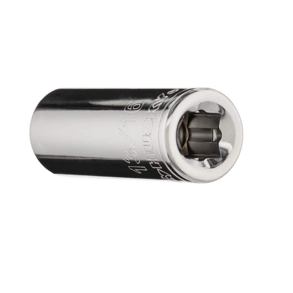 Husky 1/2 in. drive sockets are manufactured from Chrome Alloy steel and heat treated for added strength and wear protection; providing durability for a lifetime of hard use. Each socket features chamfered lead INS for quick and easy placement onto fasteners every time. Their polished chrome finish resist rust and corrosion and easily wipes clean of oil and dirt.