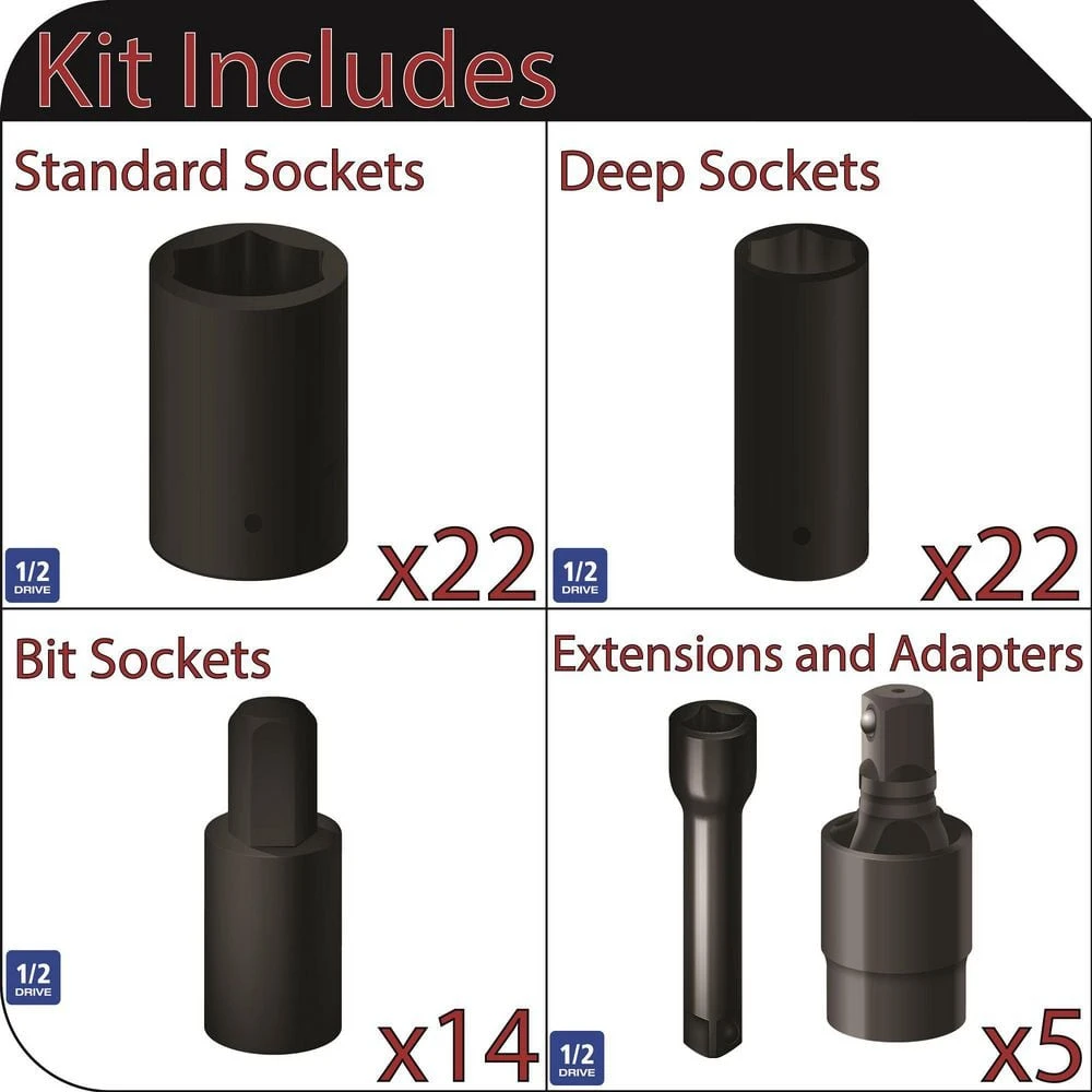 - Includes 22 shallow and 22 deep impact sockets (7/16-1-1/16 in. and 13-27mm)