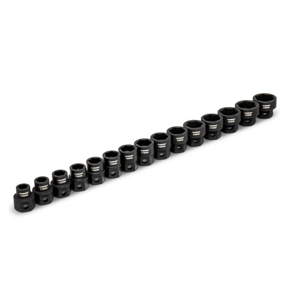 Husky 1/2 in. drive impact sockets are forged from chrome molybdenum alloy steel (Cr-Mo) and designed to withstand rigors of heavy-duty auto and industrial use. Size markings have been hard stamped into the sockets for quick and easy identification that will never wear away. This 15-piece Husky impact socket set is perfect for both the professional mechanic’s and the DIYer’s garage.