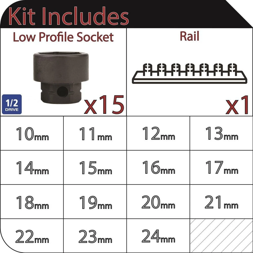 - 15-piece 1/2 in. drive set include 6-point impact sockets in 10mm, 11mm, 12mm, 13mm, 14mm, 15mm, 16mm, 17mm, 18mm, 19mm, 20mm, 21mm, 22mm, 23mm, and 24mm sizes