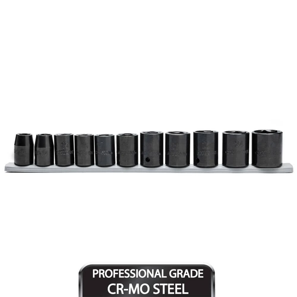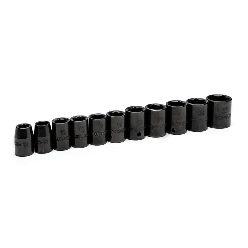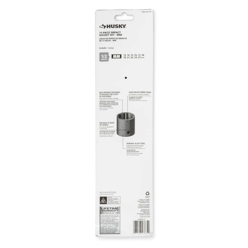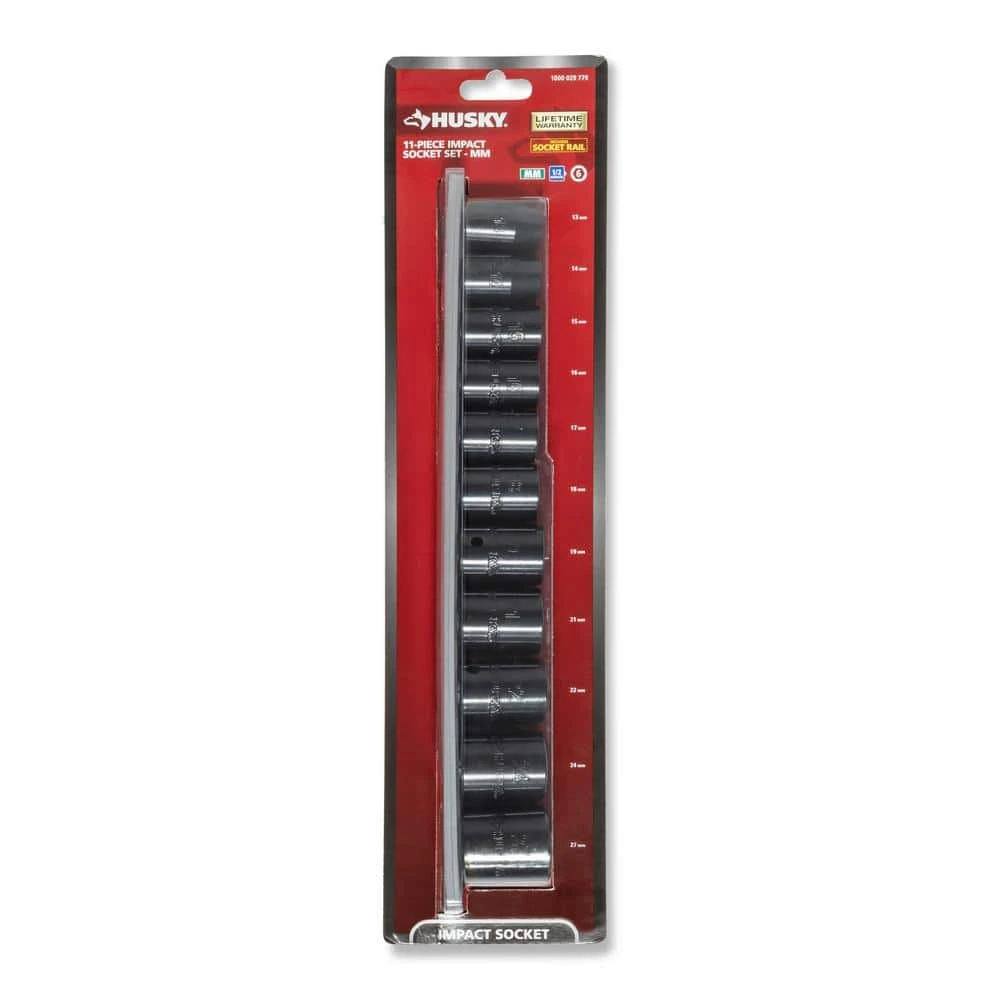 Husky 1/2 in. drive impact sockets are forged from chrome molybdenum alloy steel (Cr-Mo) and designed to withstand the rigors of heavy-duty auto and industrial use. Size markings have been hard stamped into the sockets for quick and easy identification that will never wear away. This 11-piece Husky impact socket set is perfect for both the professional mechanic’s and the DIYer’s garage.