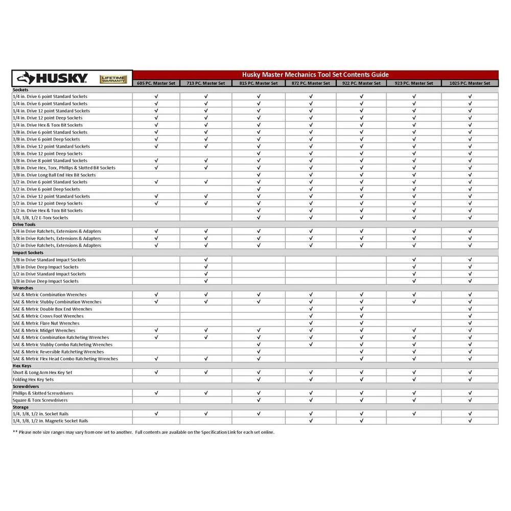 Always have the right tool for the job with this Husky Master Mechanics Tool Set. The set contains 713-pieces and has most tools a mechanic needs. It includes 333-chrome sockets and 101-impact sockets in the most-used drive sizes, both SAE and metric. 100-wrenches of various types include standard combination, ratcheting, flex head ratcheting and specialty sizes. 9-drive tools, 26-extensions, u-joints, and adapters, and 11- screwdrivers let you spend more time on repairs and less time searching for tools.