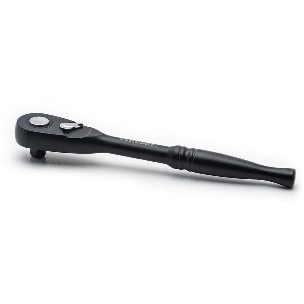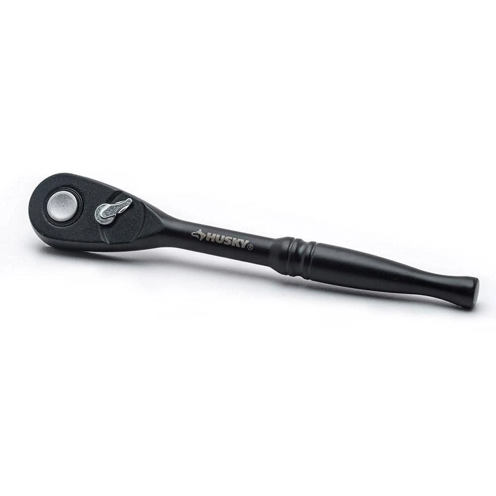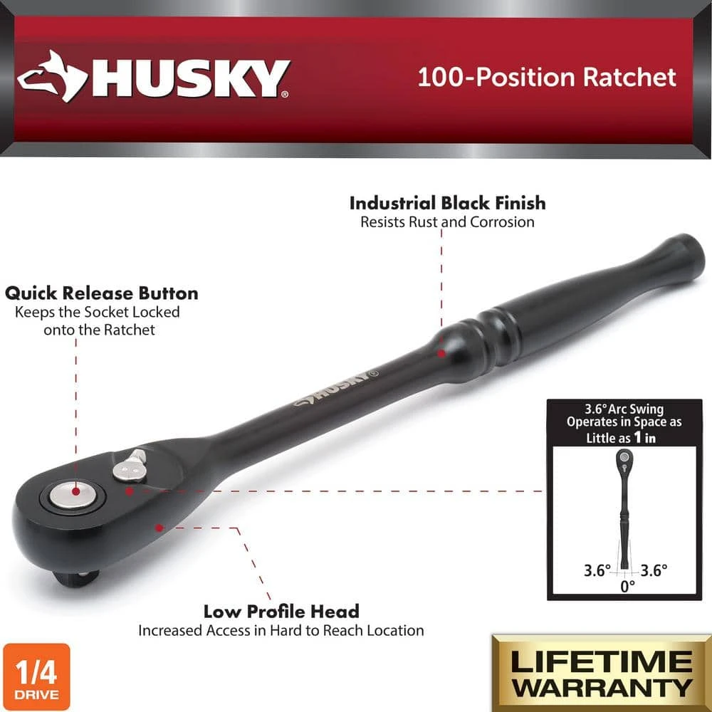 The Dual-Pawl technology of the New Husky 100-Position 1/4 in. drive ratchet provides access to turn fasteners where other ratchets can’t with its ultra-narrow 3.6° arc swing. It is 10% longer handle allows for increased reach to access hard reaching fasteners and improves overall leverage. The Industrial grade black finish gives the tool a sleek look while adding durability and corrosion prevention.