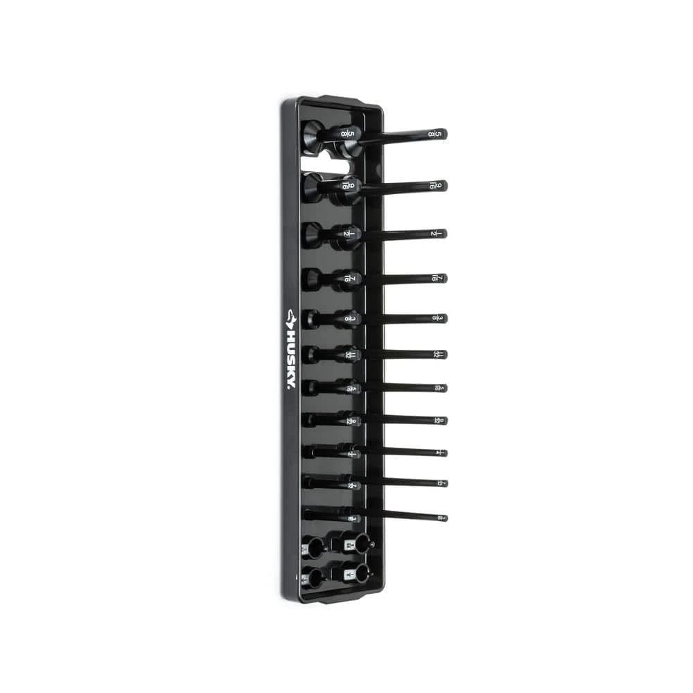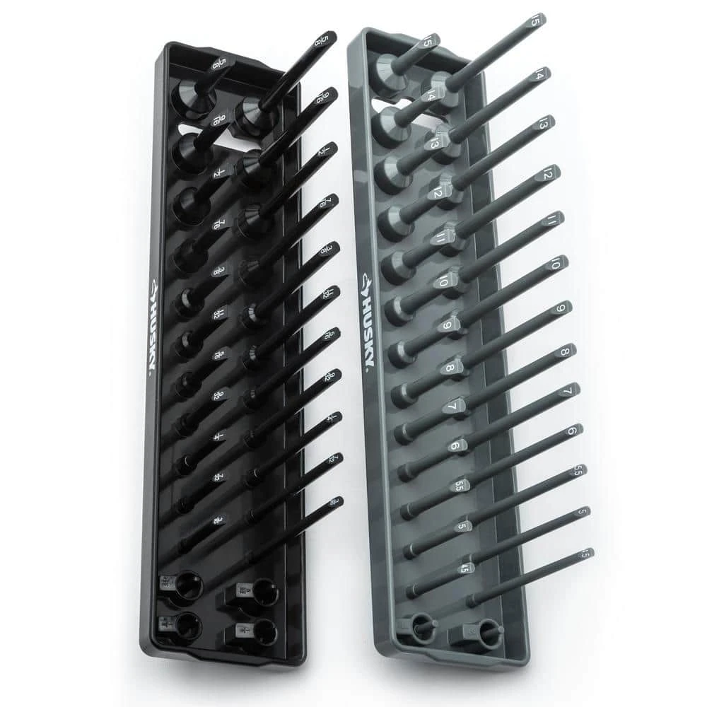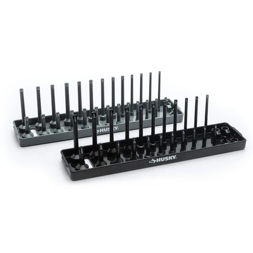 The Husky 1/4 in. Drive Socket Organizer Tray Set, SAE/MM (2-Piece) helps eliminate clutter by giving each 1/4 in. drive socket a clearly marked storage spot. Each tray holds both standard and deep 1/4 in. drive sockets. The trays are made of durable plastic and are color coded to help quickly identify the needed tray.