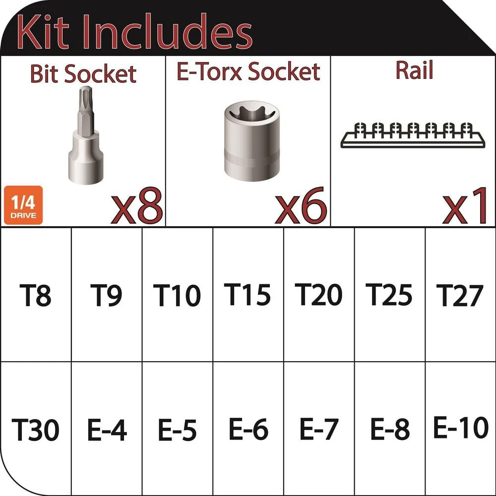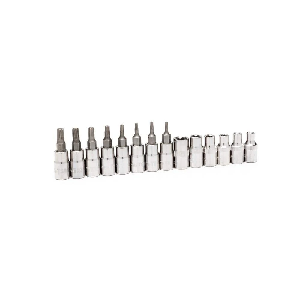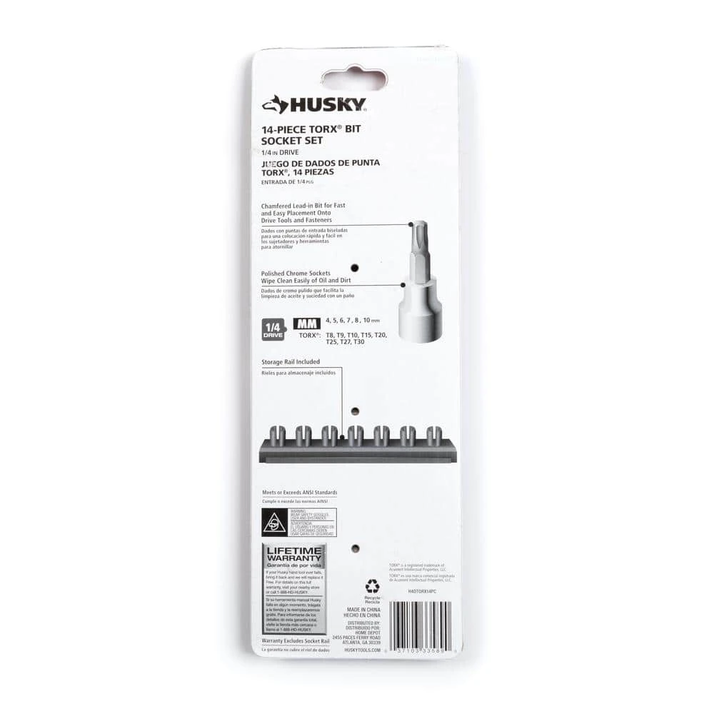 The 14-piece Husky 1/4 in. Drive Torx Bit Socket Set is a great addition to any tool box or socket collection. This set comes equipped with 1/4 in. drive bit sockets allowing you to tackle wide a range of projects. Bit sockets give you the advantage of accessing fasteners with the reach and tight arc swing of a ratchet that standard folding or L-keys just can’t match.