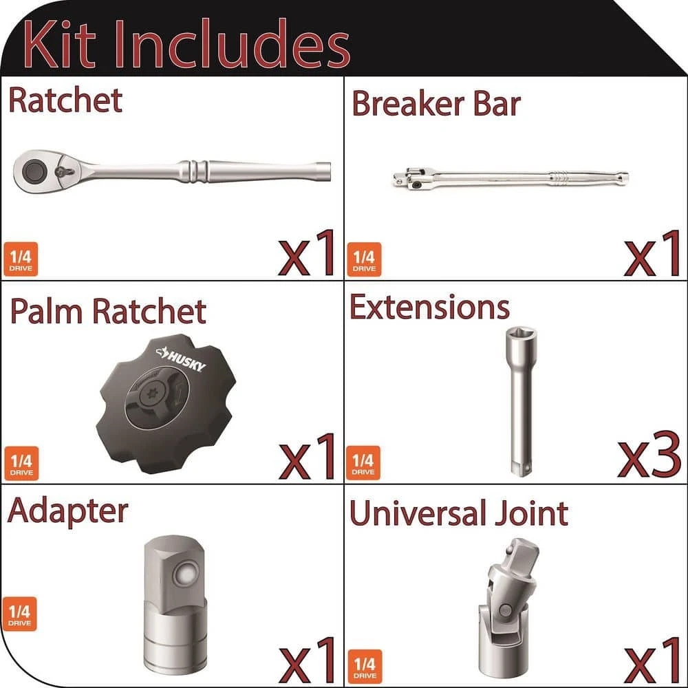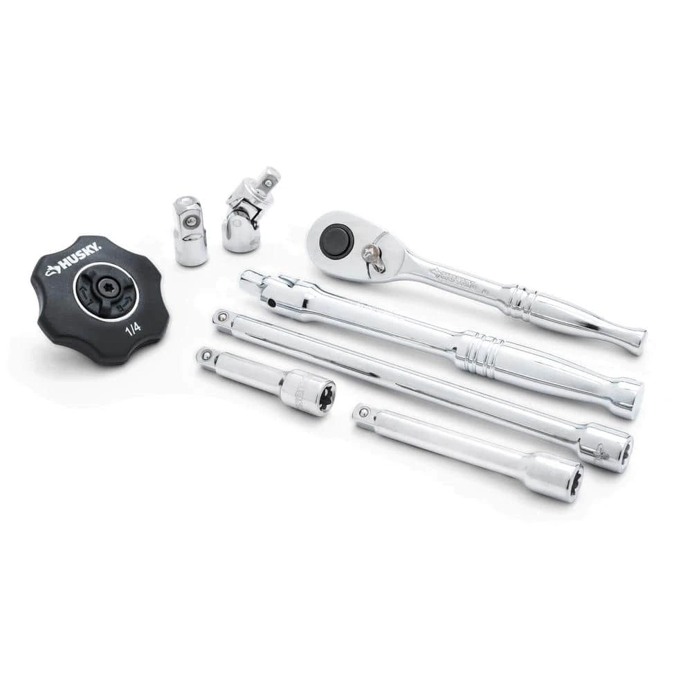 The 8-piece Husky 1/4 in. drive Ratchet and Accessory Set includes tools to complete any 1/4