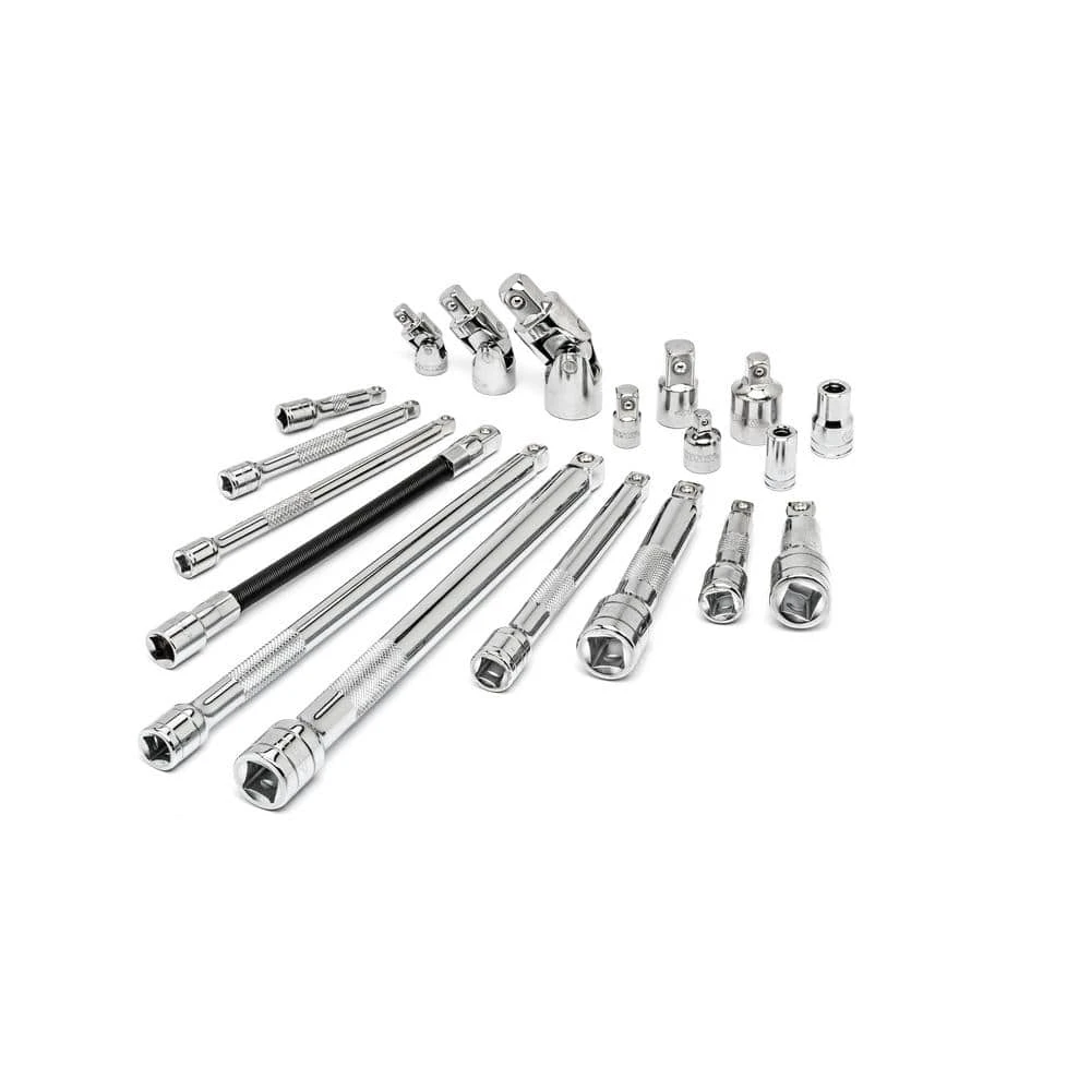 - 9 wobble extensions- 1/4 in. drive ( 2 in., 4 in., 6 in.) 3/8 in. drive ( 3 in., 6 in., 10 in.) 1/2 in. drive 3 in., 5 in., 10 in. (one) 3/8 in. drive 8 in. flex extension, 4 drive adapters (1/4°F to 3/8 m, 3/8°F to 1/4 m, 3/8°F to 1/2 m and 1/2°F to 3/8 m) 3 universal joints, 1/4 in., 3/8 in., 1/2 in., 2 bit adapter sockets, 1/4 in. and 3/8 in. drive