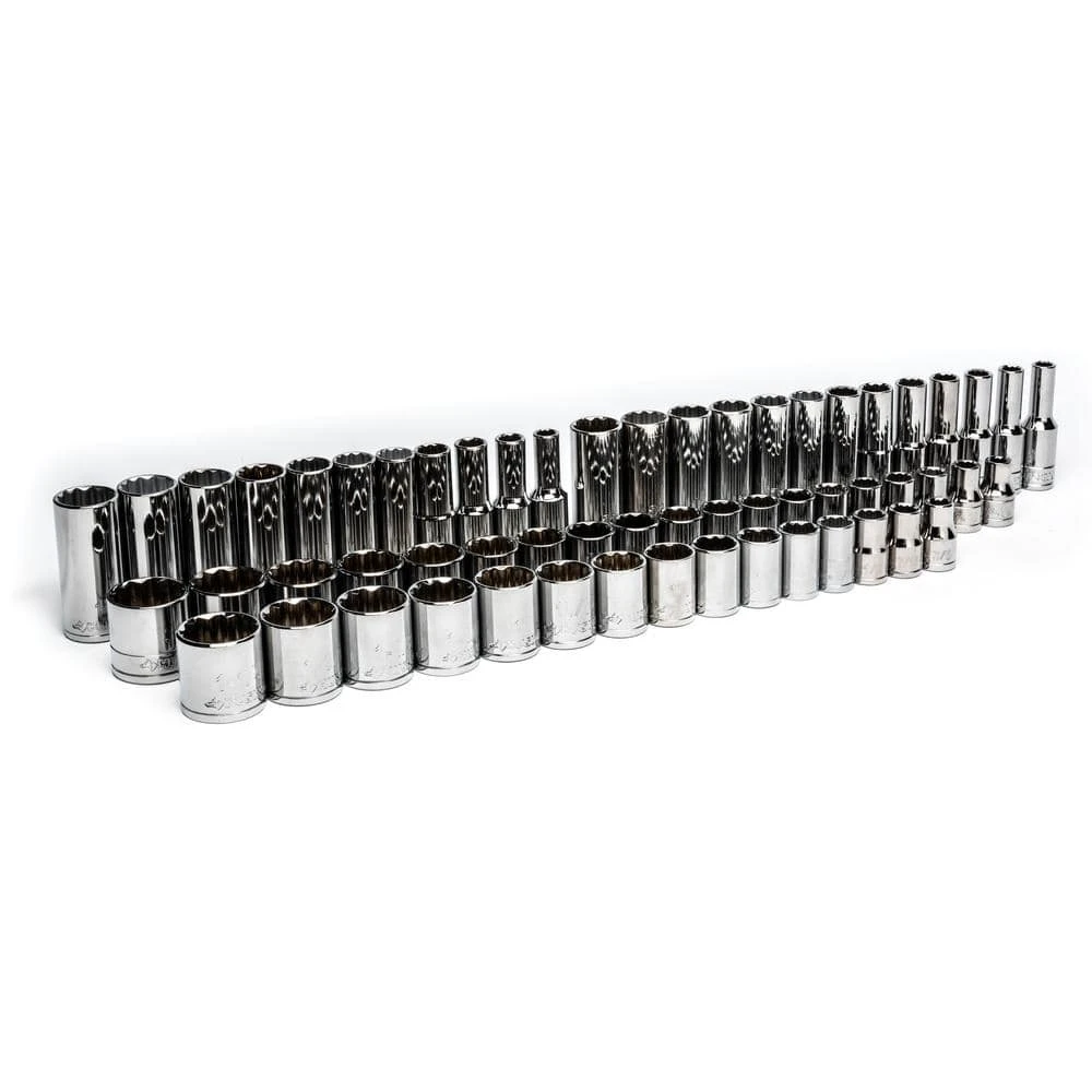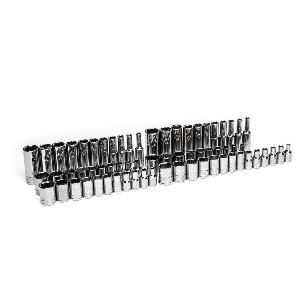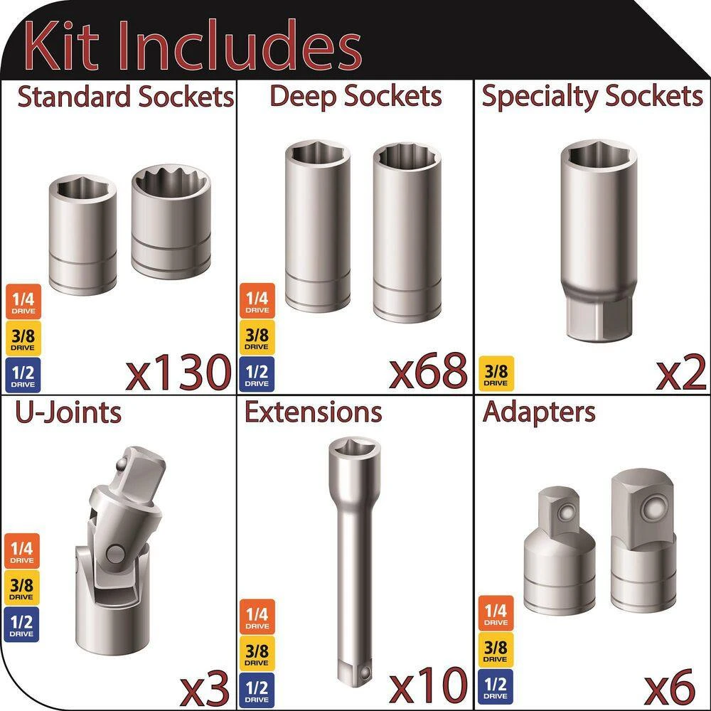 - Set includes: twenty five 1/4 in. drive 6-point sockets, twenty 1/4 in. drive 12-point sockets, twenty 2-1/4 in. drive 6-point deep sockets, twenty eight 3/8 in. drive 6-point sockets, twenty 3-3/8 in. drive 12-point sockets, twenty 2-3/8 in. drive 6-point deep sockets, 2-3/8 in. drive spark plug sockets, thirty 4-1/2 in. drive 12-point sockets, twenty 4-1/2 in. drive 12-point deep sockets