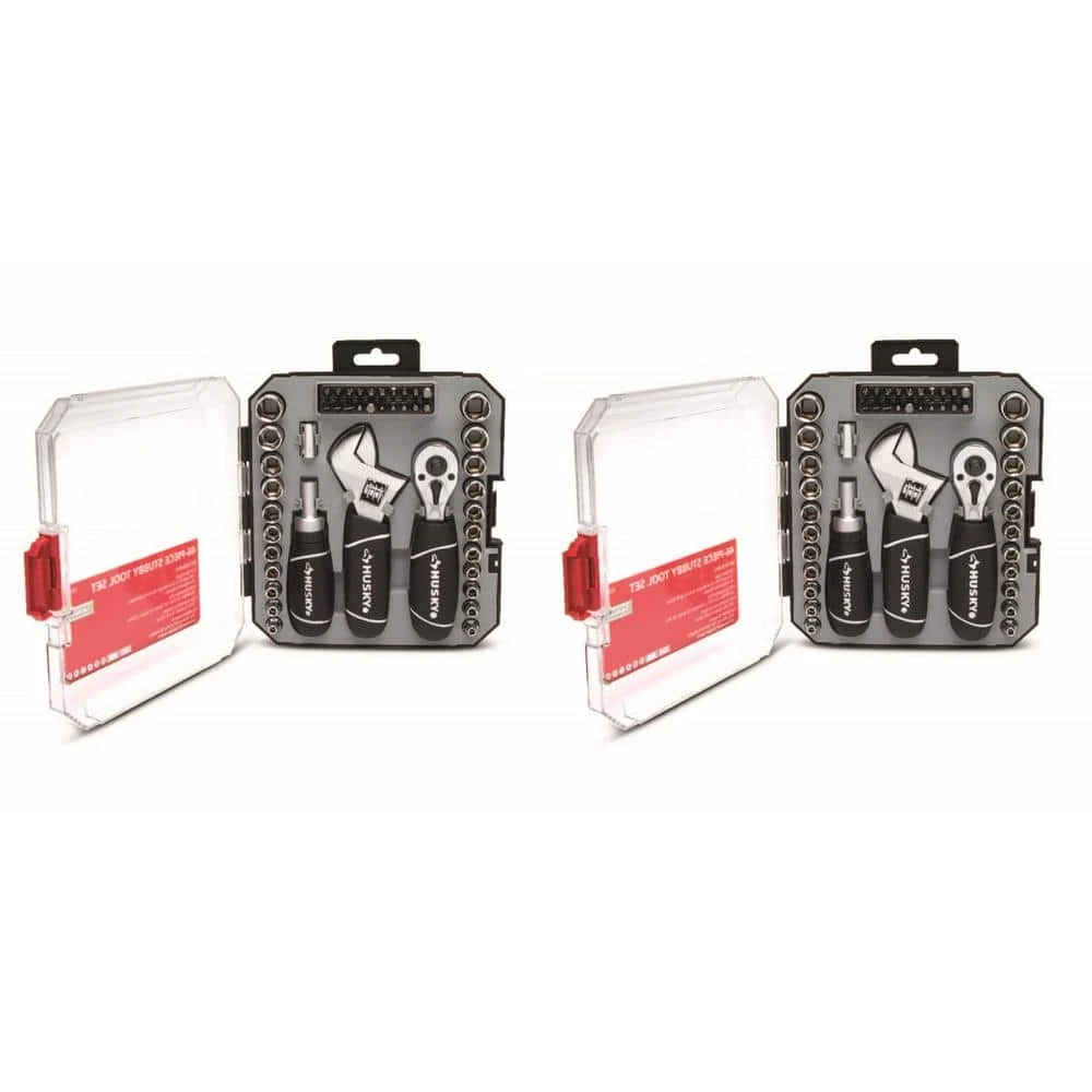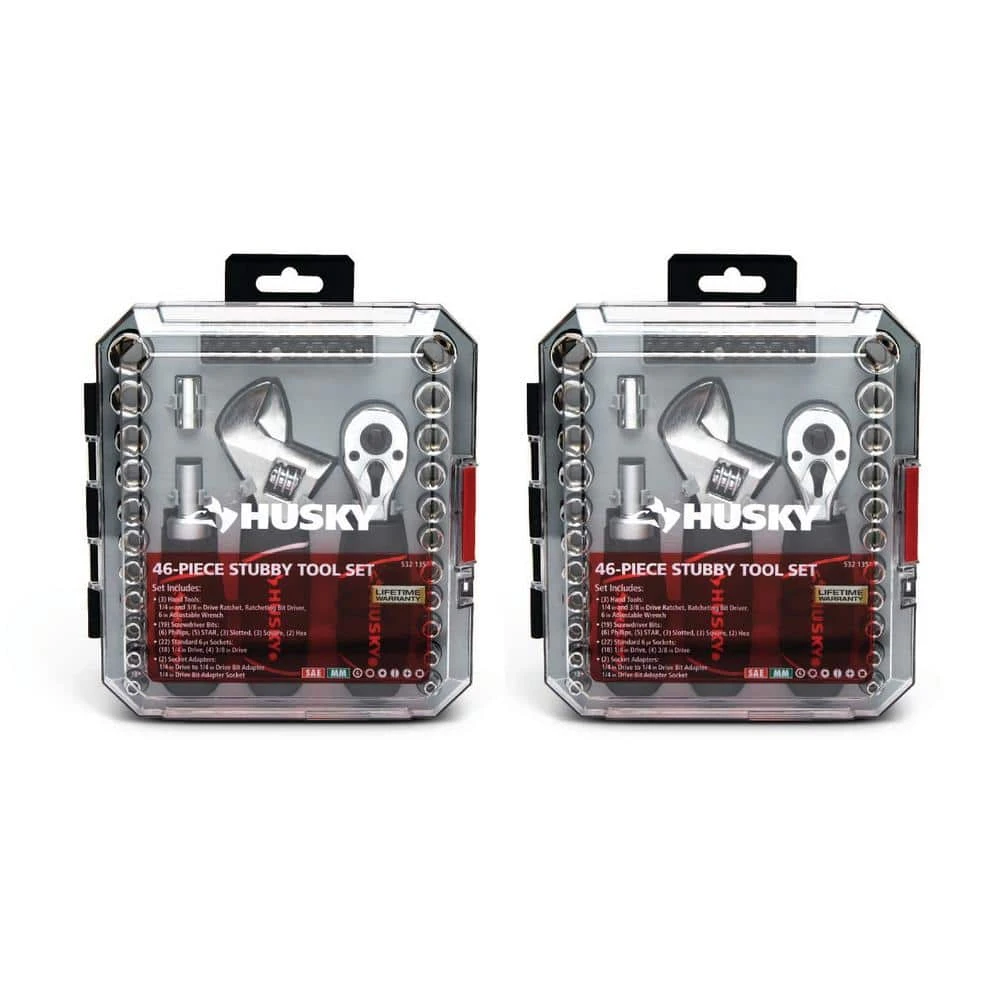 This 2-pack of Husky 46-Piece Stubby Ratchet Sets includes 44 sockets and 40 screwdriver bits to handle various jobs around the house. The stubby ratchet features a 1/4 in. drive tang on one side and 3/8 in. drive tang on the opposite side, giving you the versatility to use both drive sizes on one ratchet. The 72-tooth stubby ratchet needs only a 5° swing arc to turn a fastener, allowing you to work in tight places. Co-molded grips on the ratchet, ratcheting bit driver, and adjustable wrench provide a strong and comfortable grip to get the job done. The magnetic bit driver works with all standard 1/4 in. drive bits. Sets are kept organized and travel-ready in plastic storage cases marked with each size.