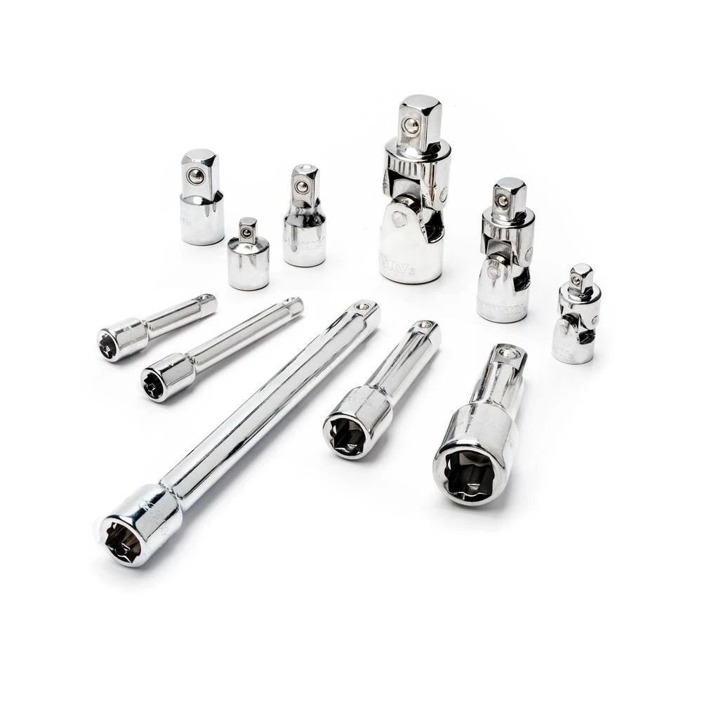 The Husky 11-Piece Master Accessory Set includes a variety of extensions, adapters and universal joints made from alloy steel for strength and long-lasting performance. The finish provides resistance to corrosion. The chamfered lead-in on the drive end for quick and easy attachment to the drive tools.