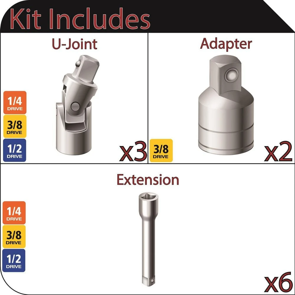 - Set includes six extensions, two 1/4 in. drive, 2 in. and 3 in., three 3/8 in. drive, 1-1/2 in. , 3 in., 6 in,. and one 1/2 in. drive, 3 in, three Universal Joints, 1/4 in., 3/8i n., 1/2 in. drives, and 2 drive adapters, a 3/8 in. male x 1/4 in. female and a 3/8 in. male x 1/2 in. female.