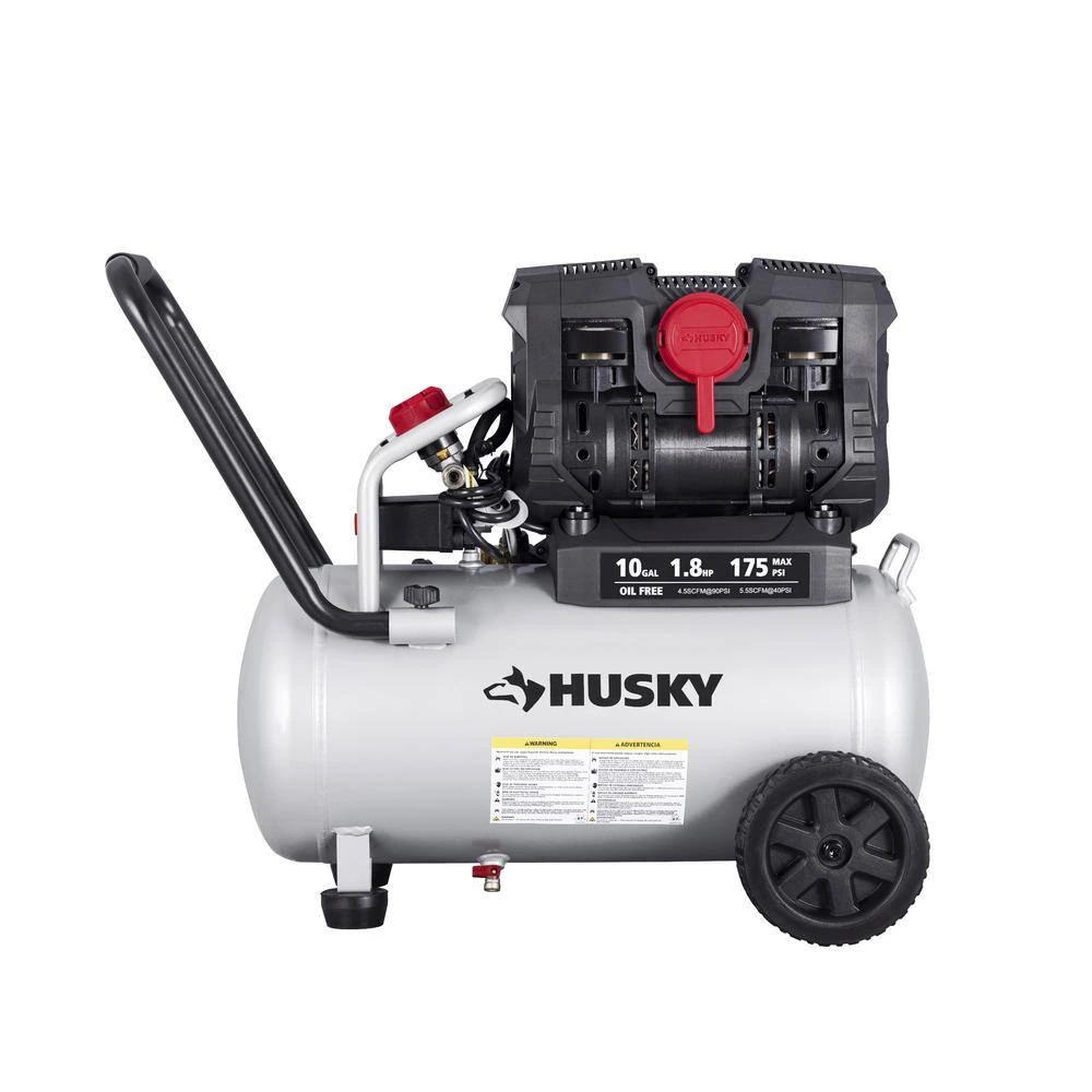 Introducing the Husky 10 Gal. 175 MAX PSI Quiet Hotdog Air Compressor – the powerhouse your projects have been waiting for. Engineered with precision and power, this compressor is designed to elevate your workmanship to new heights. Let’s dive into what makes this compressor a game-changer: Powerful Performance: with a robust 1.6 HP motor and a 10-Gal. steel tank, the Husky compressor delivers consistent and reliable performance. Maximum Pressure, Minimal Noise: Experience the best of both worlds with an impressive 175 MAX psi, coupled with remarkably low noise levels of just 70 decibels. Efficient Operation: Equipped with a 5.5 SCFM at 40 and 4.5 SCFM at 90, this compressor provides ample airflow for a variety of pneumatic tools. Precision Monitoring: Stay in control with dual gauges that accurately display both tank and tool pressure. Built for Convenience: Featuring a single quick coupler, air pressure regulator and a removable handle. Stability and Mobility: Say goodbye to wobbles and shakes, thanks to rubber feet that reduce vibration during operation. Plus, large rubber wheels make transportation a breeze. Durable and Reliable: Crafted from high-quality materials and engineered for durability, the Husky compressor is built to withstand the rigors of daily use. Easy Maintenance: Simplify maintenance tasks with a convenient air tank drain valve, allowing you to keep your compressor in top condition with minimal effort.