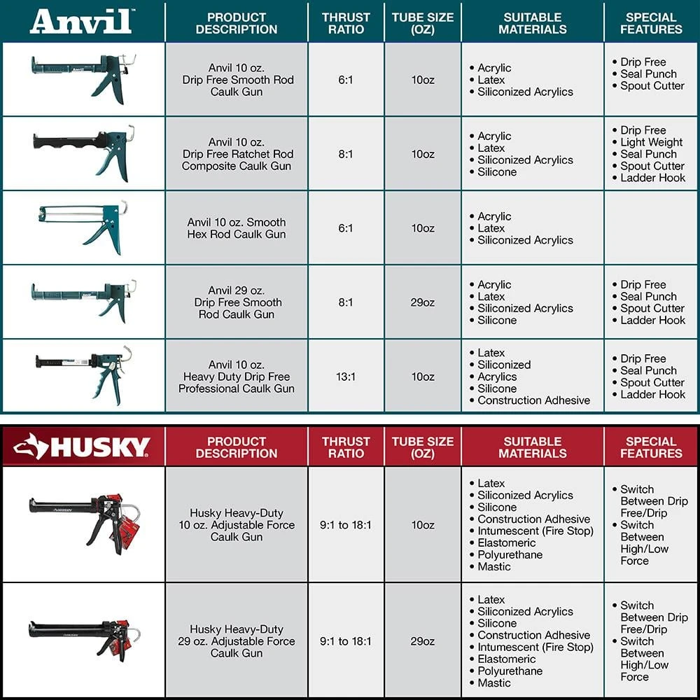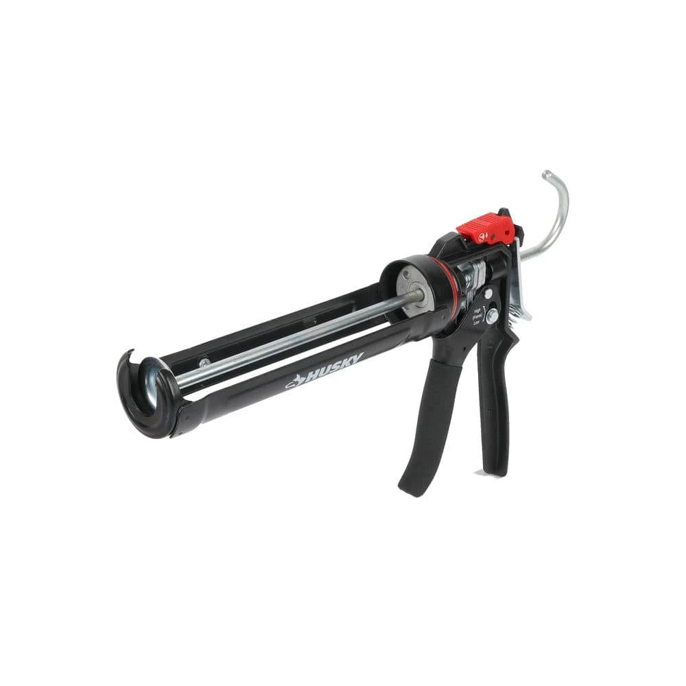 The Husky heavy-duty high-leverage caulk gun is designed to hold standard size 10 oz. tubes. It has a switch between drip and drip free for desired application and features an adjustable thrust ratio of 9:1 and 18:1 to make applying any caulk, construction adhesive, or sealant effortless. The rotatable barrel makes for easy application around corners and edges while the padded cushion-grip trigger provides added comfort. The rounded skeleton frame helps ensure quick cartridge loading and removal. A convenient seal punch tool located near the trigger is used to break the inner seal of your tube. This caulk gun is perfect any job and is backed by Husky’s lifetime warranty.