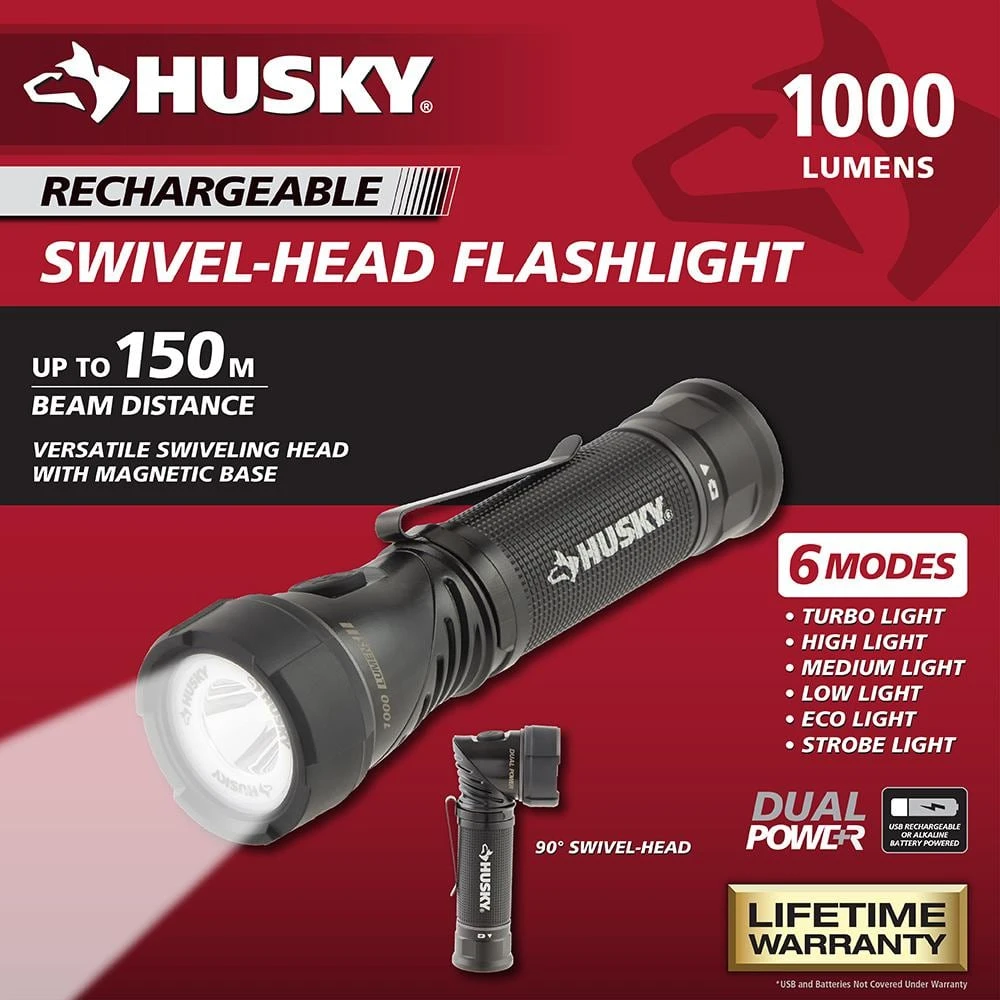 The Husky 1000 Lumen Swivel-Head Rechargeable Flashlight is designed for exceptional brightness and versatility to illuminate small to medium size areas. A swivel-head design rotates 90º for multidirectional adaptability and the magnetic base allows you to mount the light to any metal surface for convenient, hands-free lighting. This multipurpose flashlight features high-power LED technology for brilliant illumination and 6-light modes to adapt to a variety of needs. Dual-Power is a hybrid system that operates on either an included rechargeable lithium-ion battery or 3 AAA disposable alkaline batteries (not included). A USB Type-C port allows for fast input charging with the included cable. The flashlight includes a 1300-lumen turbo mode, 60-hour ECO mode runtime, memory mode recall, and a color-coded battery level indicator for easy power level monitoring. A sturdy clip allows you to easily carry this light on a belt or pocket. Crafted from durable aircraft-grade aluminum, it is impact-resistant, water-resistant with an IP54 rating, tested to ANSI/FL1 standards and backed by a Husky lifetime warranty, ensuring long-lasting reliability and excellent performance in any environment.