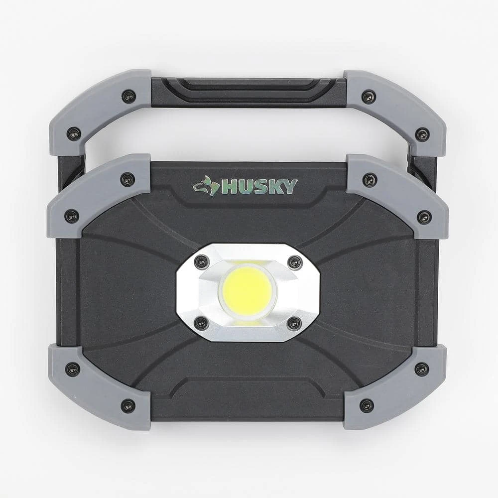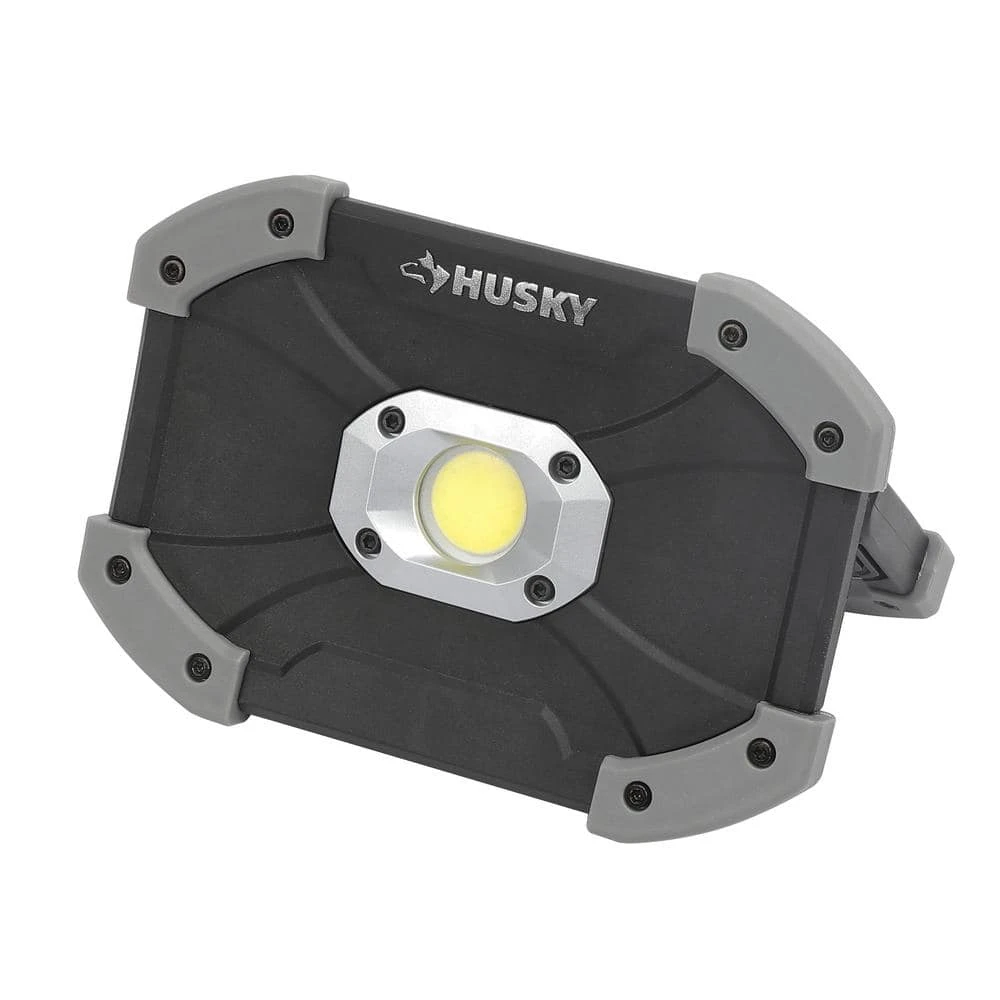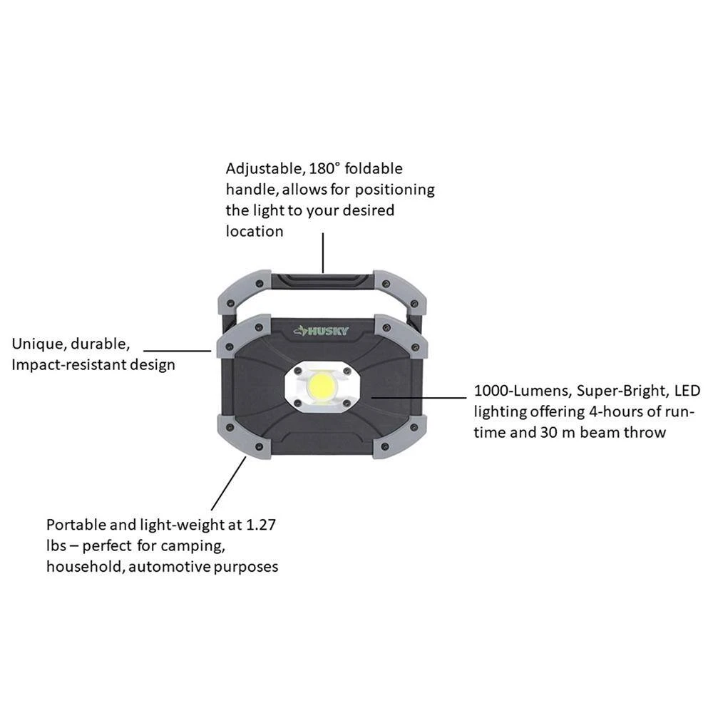 This Husky Utility LED light features a unique design with durable plastic construction. It’s equipped with super bright LED lighting, offering up to 1000 Lumens, 4-hours of run-time and 30 m of beam throw. Its bright illumination and light weight, makes this a perfect light to have for multiple uses. Featured is a 180° adjustable, foldable handlethat allows for easy carry or positioning at the perfect angle. The battery compartment is easy to open and stores 6 AA alkaline batteries, included.