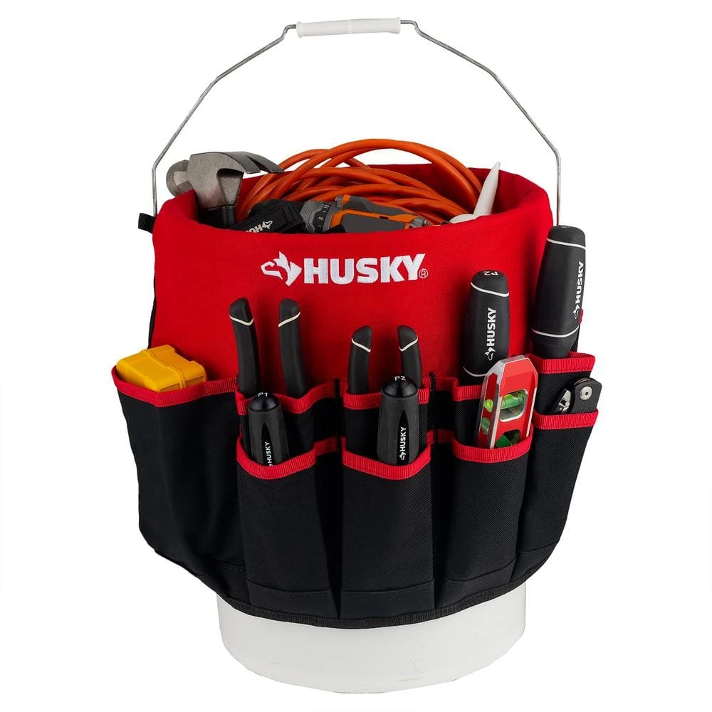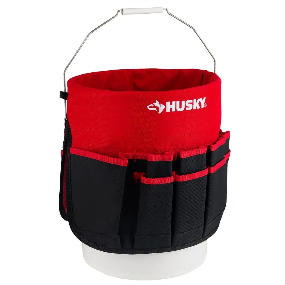 Get convenient and easy storage with the Husky Bucket Jockey. Constructed of 600 Denier water-resistant material, its innovative design features deeper pockets to allow a more versatile array of tools and accessories to be stored with ease. Pair with The Home Depot Homer 5 Gallon Bucket – as the Husky 12 in. tool bucket storage is designed to fit on the outside of your bucket. The Husky Bucket Jockey is equipped with 30 pockets in total for optimal storage.