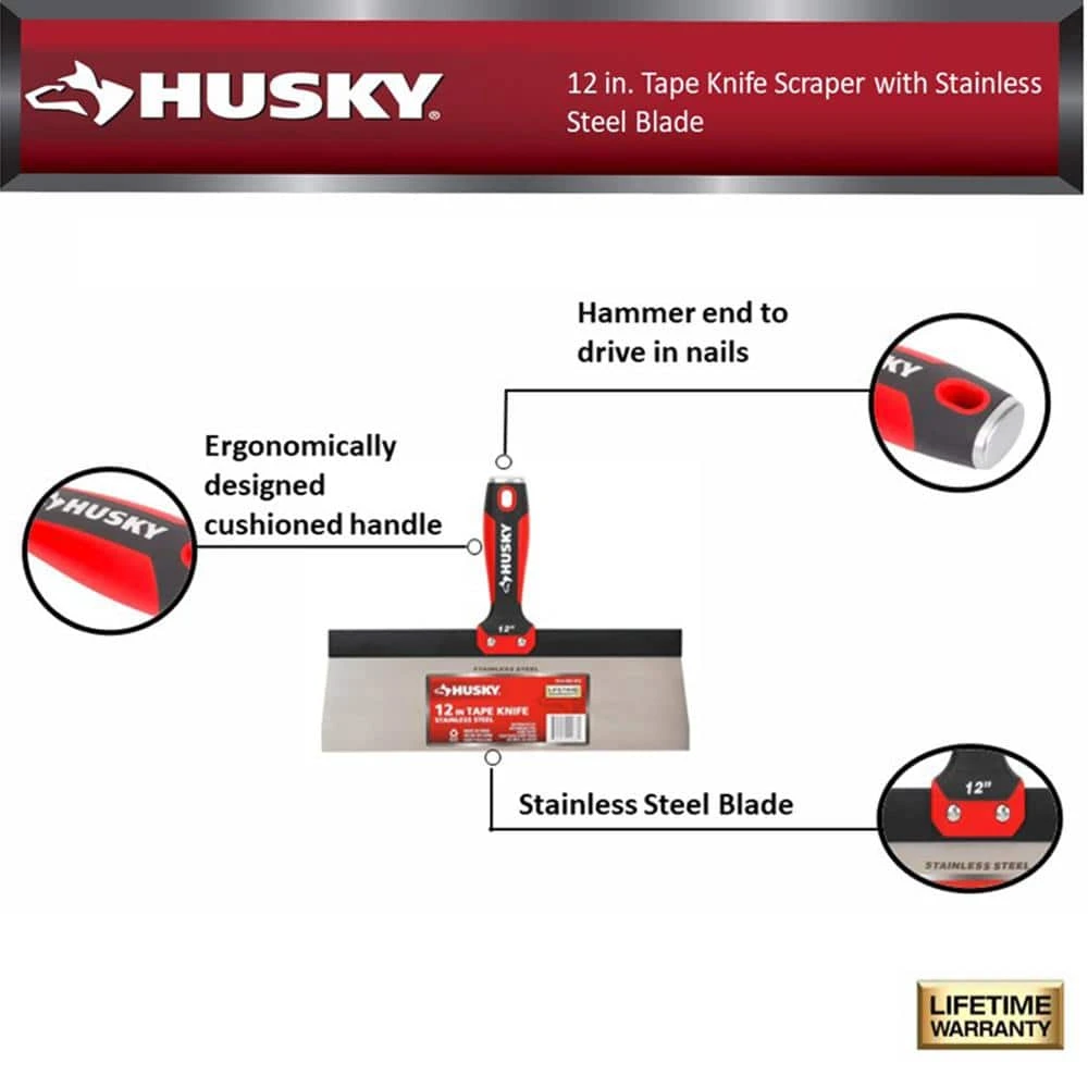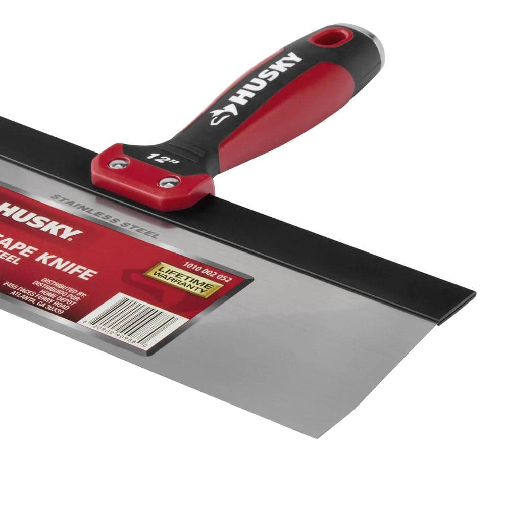 The Husky 12 in. taping knives are made of hardened and tempered stainless steel for durability and offer excellent control for feathering and knockdown texturing. The tapered blade is perfect for running corners. A heavy-duty aluminum backing plate provides rigidity. The ergonomic soft grip handle ensures a firm comfortable grip.