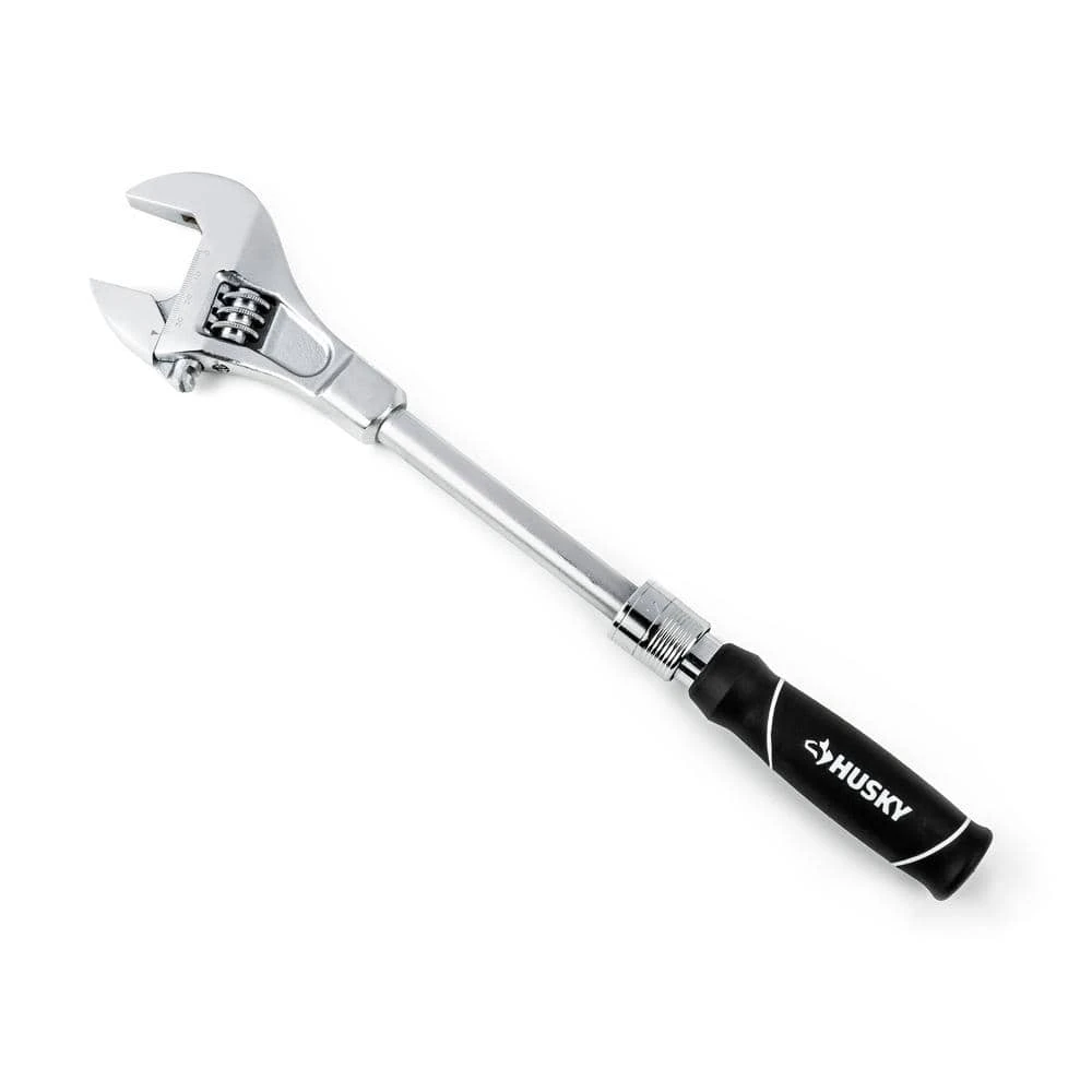 The Husky extendable adjustable wrench allows you to adjust the length from 12 in. to 16 in., depending on the user’s need. It features alloy steel construction for strength and durability, along with a finish that provides resistance to corrosion. The head adjusts from 0 in. to 1-1/2 in.