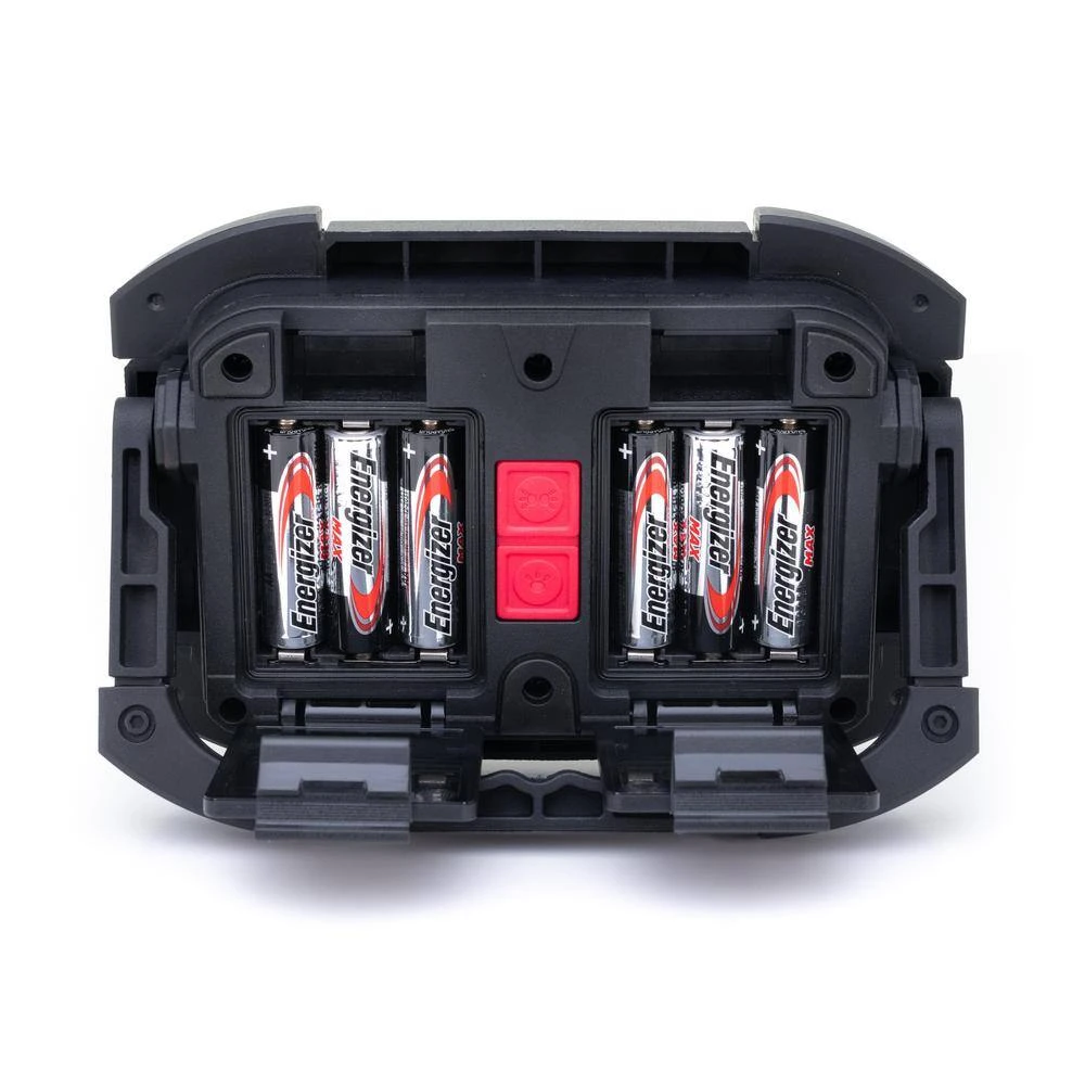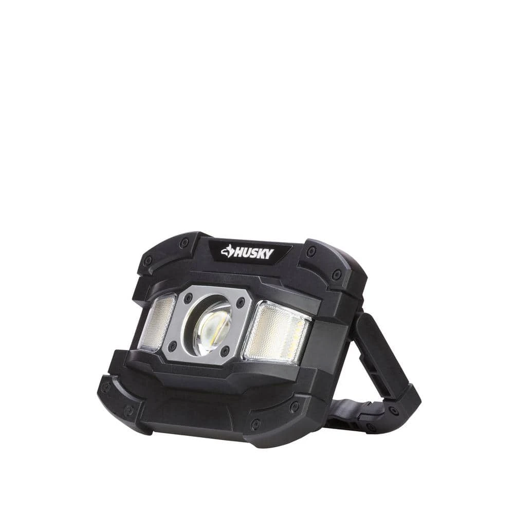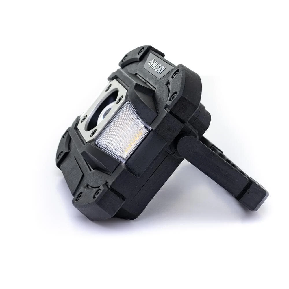 The Husky 1200 Lumen Broad Range Utility LED Light provides extended brightness with broad range technology. Its comes equipped with Hi and Low light modes. Included are 6 AA alkaline batteries and a retractable stand with handle.