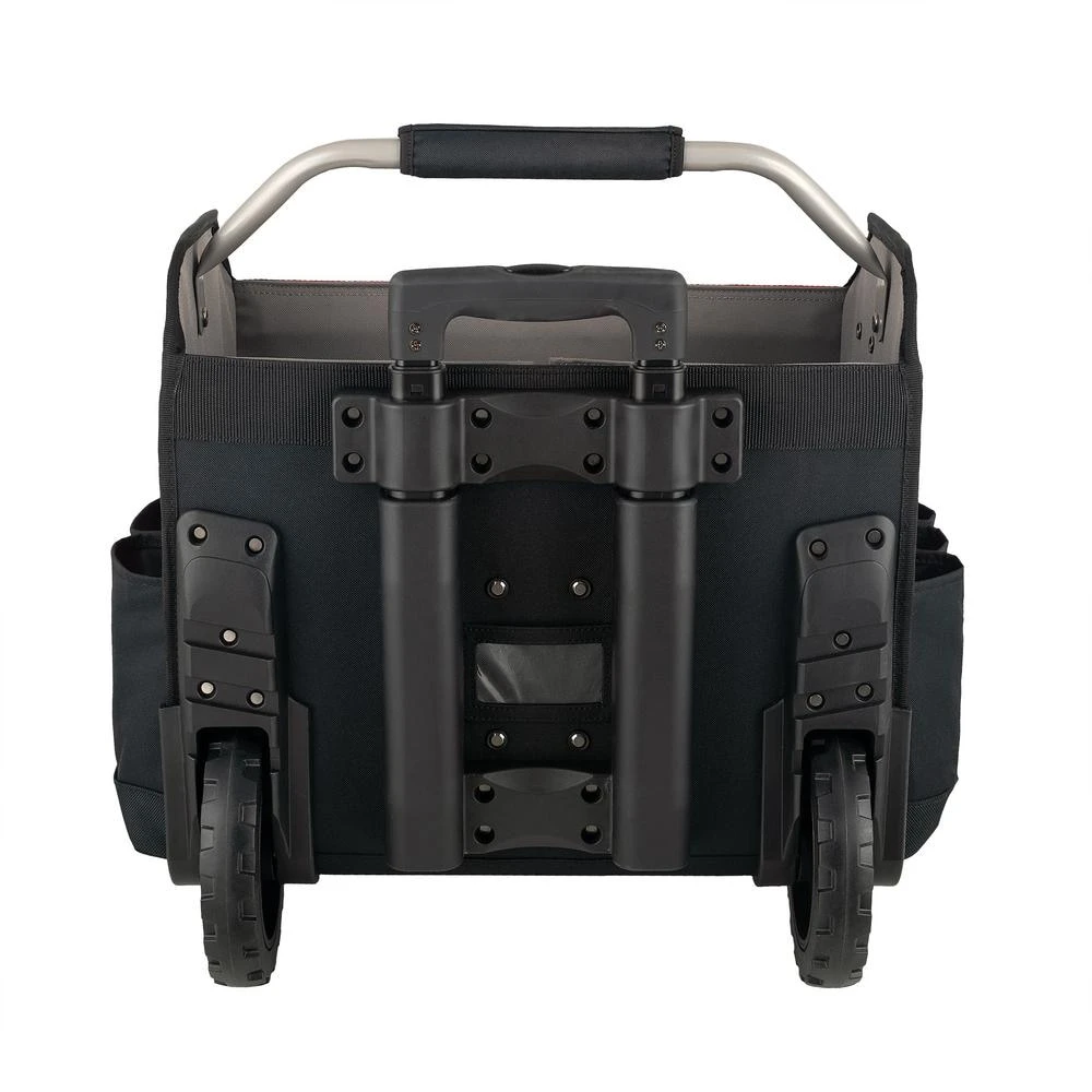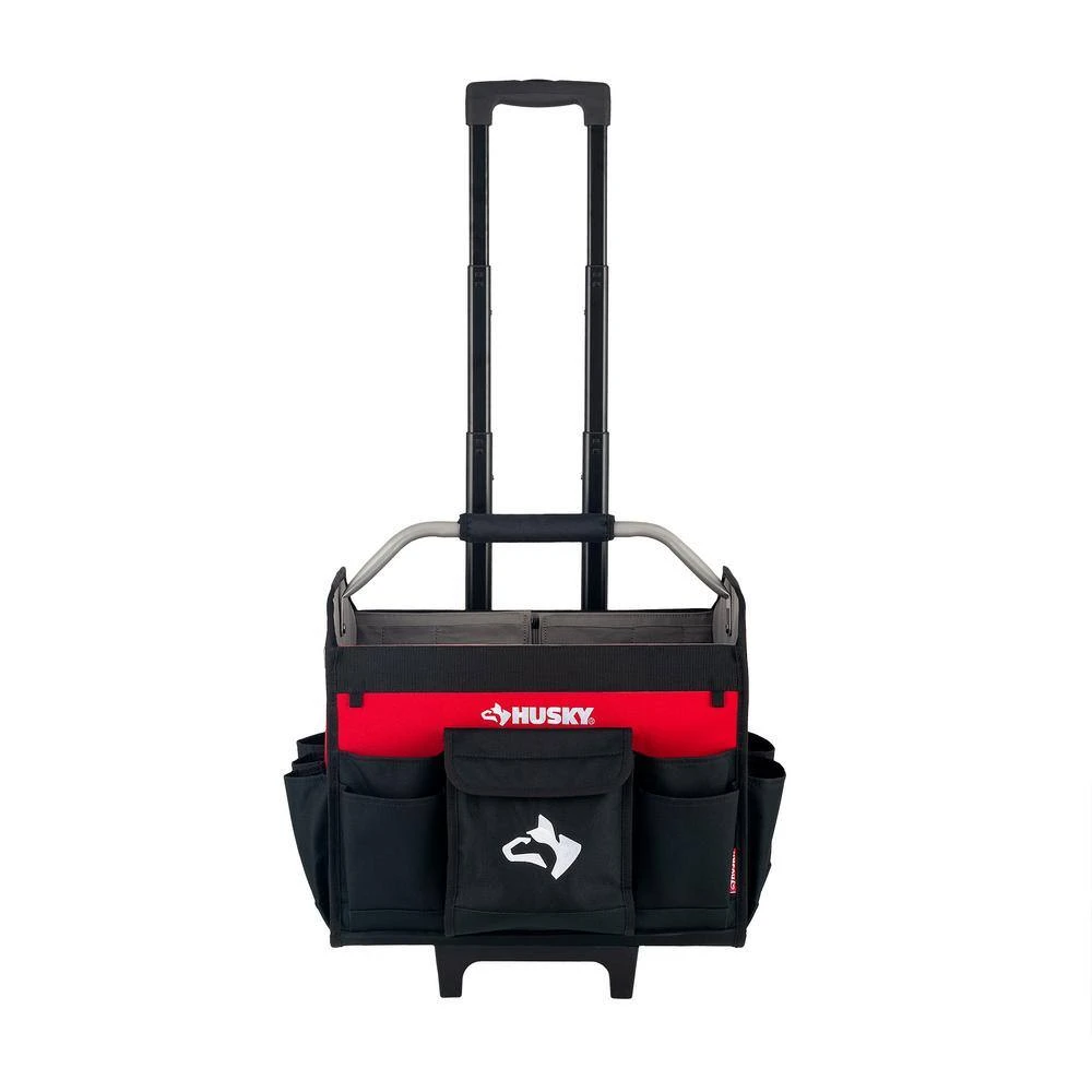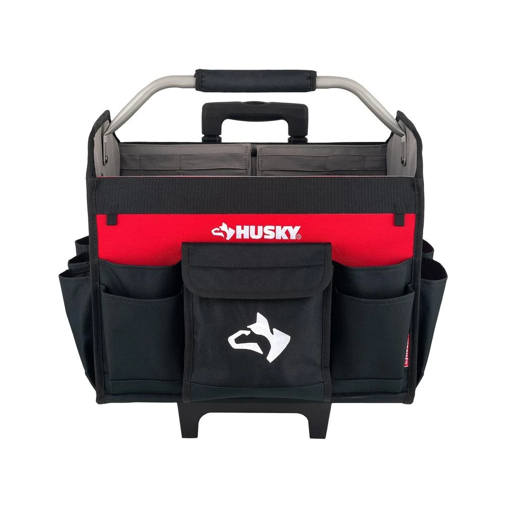The Husky 18 in. Rolling Open Tool Bag is as heavy-duty as it gets. This tool bag features a telescoping handle for easy transporting ability. The two 7 in. wheels are extremely durable and perfect for rolling over any obstacle while on the jobsite or DIY project. This rolling tool bag also features durable front feet while allow the entire bag to stand freely and securely while you are at work. The padded handle grip allows you to pick the tool bag up to move wherever needed and load into a vehicle with ease. The 600-denier water-resistant material is perfect for protecting the tool bag and hand tool contents inside throughout multiple weather conditions. Be sure to add this rolling tool bag to your Husky collection today.