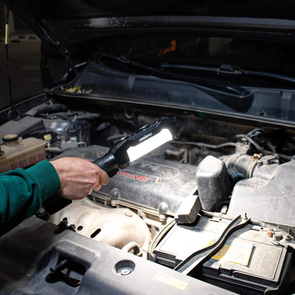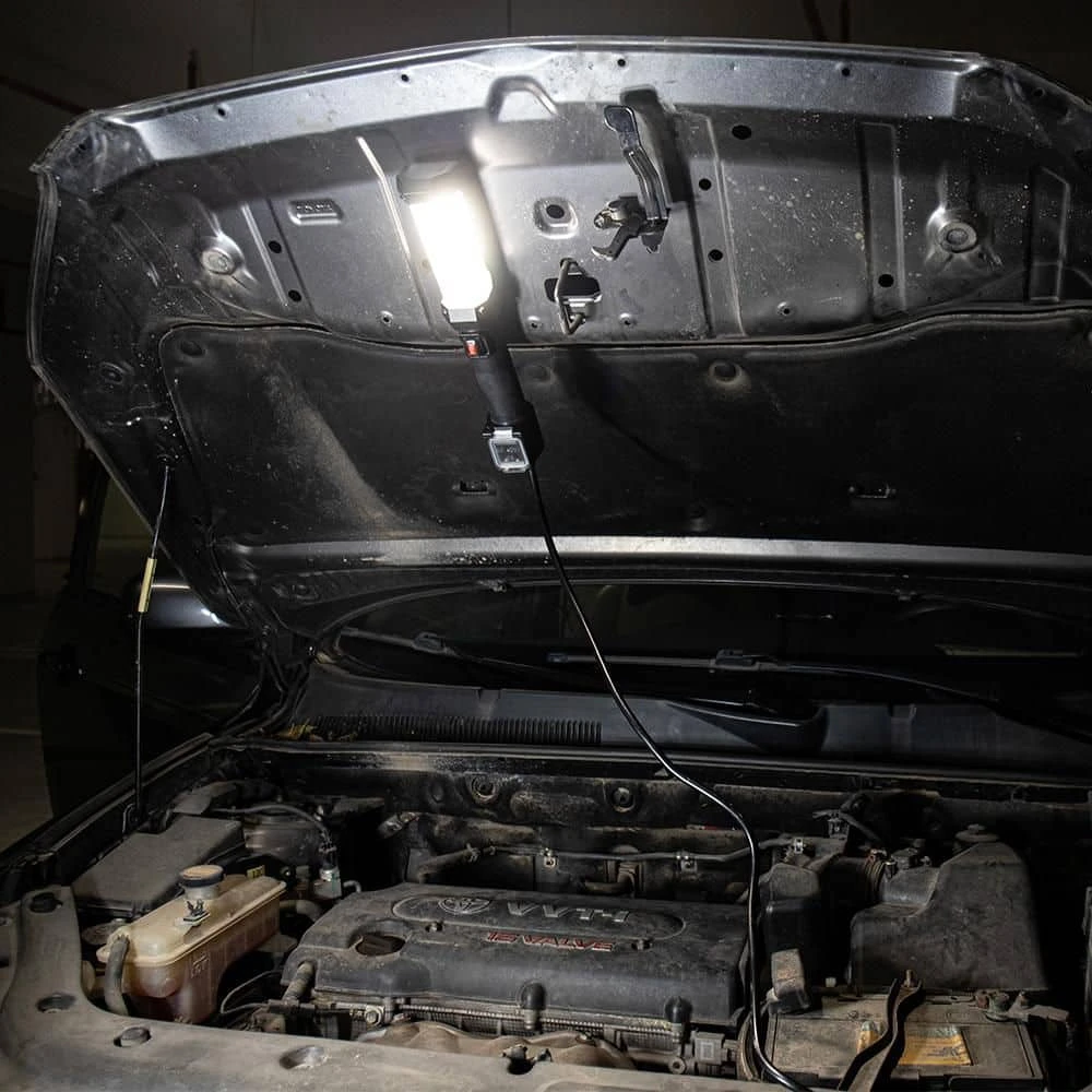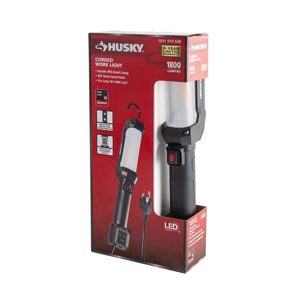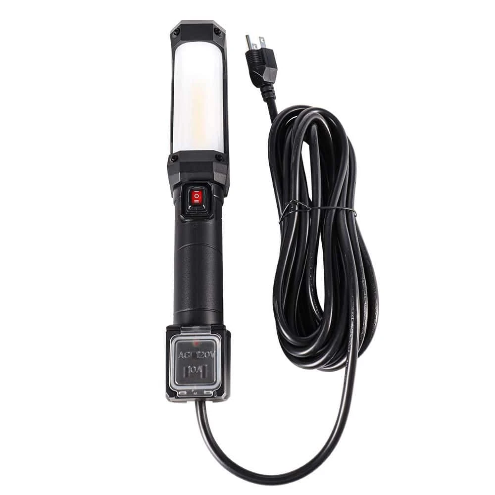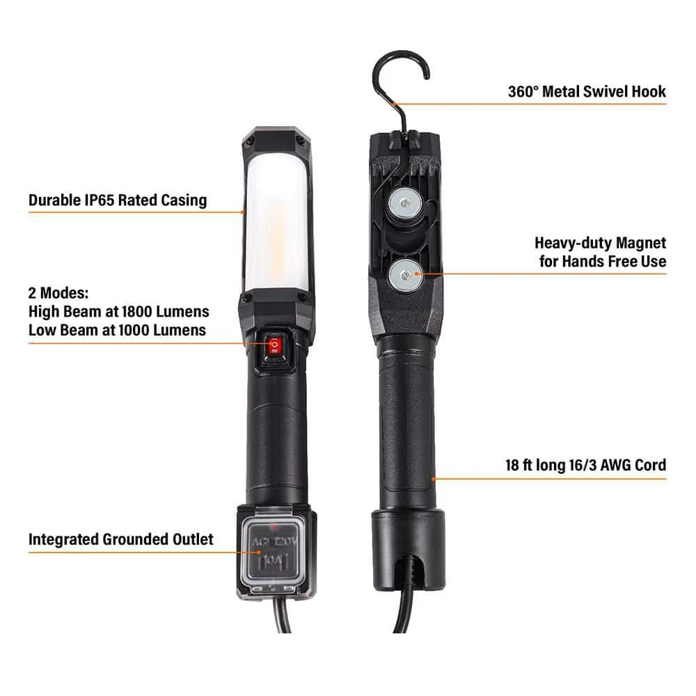 Designed with a non-slip grip on the handle of the light, the 1800 Lumens LED light is great for any garage or workshop usage. It comes with a 18 ft 16/3 AWG cable and a integrated grounded outlet, 360° metal swivel hook. Two strong Heavy-duty magnets for hands free use, wet location waterproof.