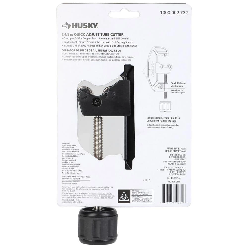 Use the Husky 2-1/8 in. Quick Release Tubing Cutter to make clean, square cuts on copper, brass, and aluminum tubing and thin-wall conduit. This tool features a convenient quick adjustment summary to facilitate fast size adjustments to various sizes of tubing. The cutter boasts a fold-away reamer and an extra blade is included and can be stored in the knob. Built to last and backed by the Husky lifetime warranty.