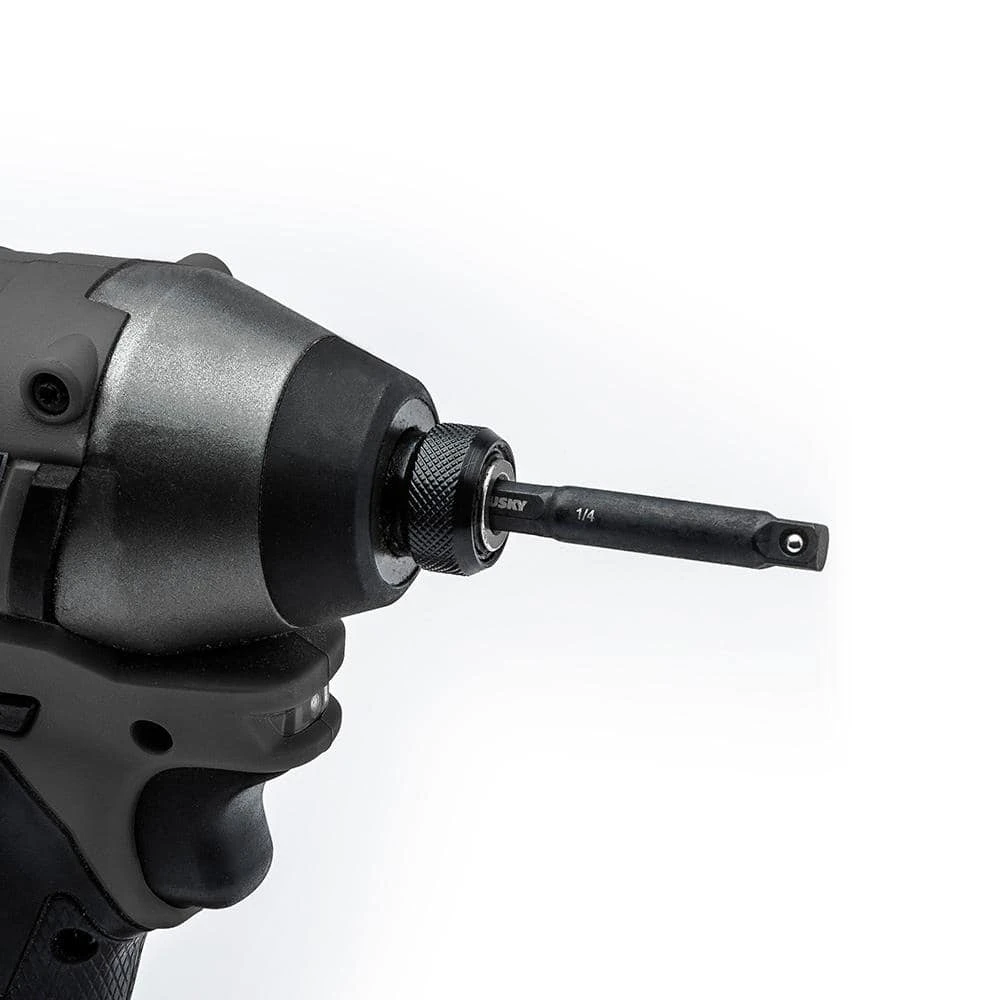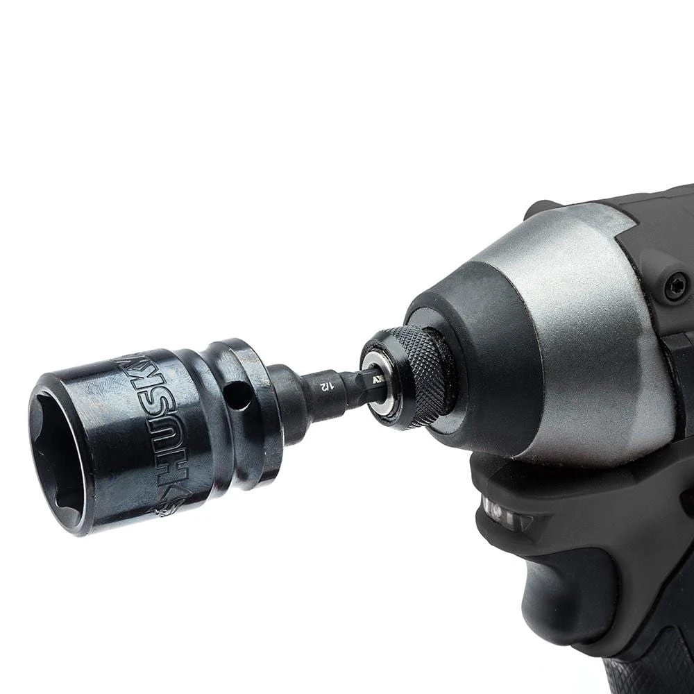 Add this must-have Husky 1/4 in. Drive Impact Driver Socket Adapter Set to your DIY or professional toolbox. To be used with impact drivers and sockets, these adapters work on 3 different drive sizes of standard and deep sockets (1/4 in., 3/8 in., and 1/2 in.). For strength and durability, they are made of heat-treated steel and offer a black oxide coating for corrosion resistance. The set quickly converts any power drill or 1/4 in. impact driver into a socket driver to easily tighten or remove fasteners.