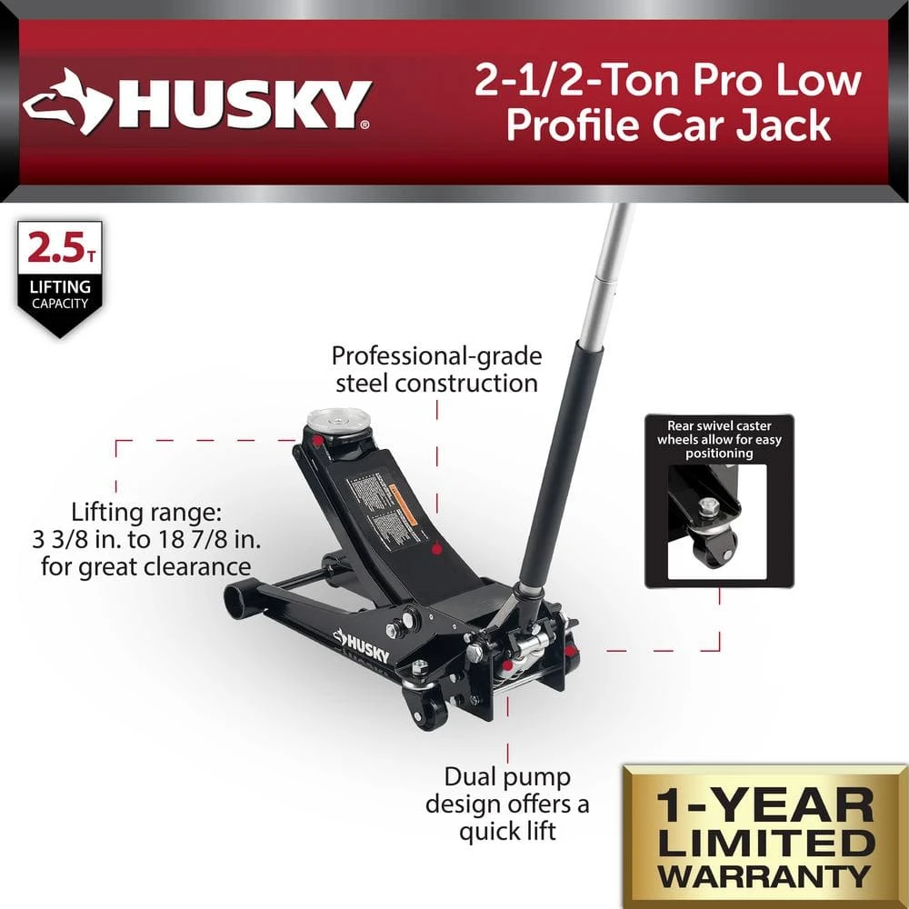 - Husky 2-1/2-ton low profile floor jack includes one 2-1/2-ton floor jack and 1 handle (oil not included)