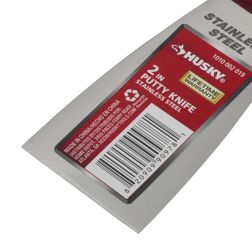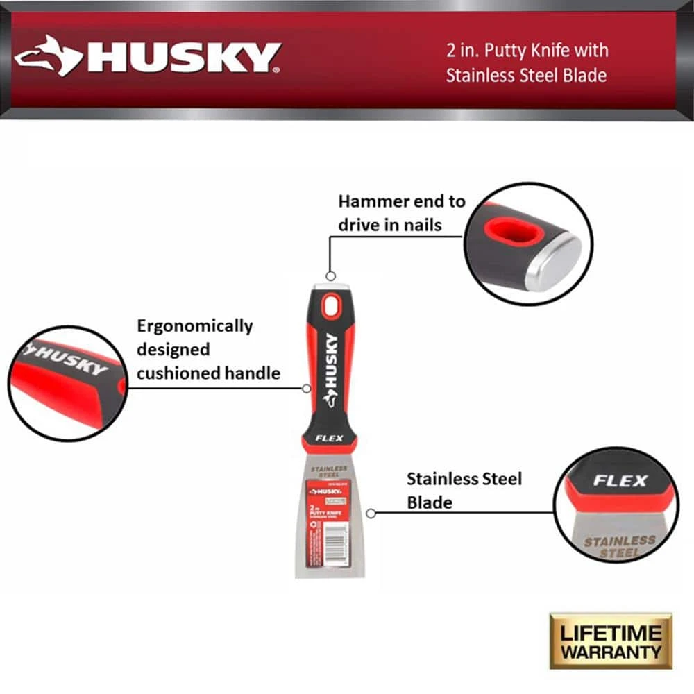The Husky 2 in. flexible joint knife features a hollow-ground stainless steel blade that offers the highest durability and quality finish. The flexible blade bends for easy application of drywall compound and spackle and is both rust resistant and solvent resistant. The soft-grip handle is ergonomically designed to provide comfort and a sturdy grip and includes a finishing hammer end to set drywall nails. Lastly, the easy peel label can be removed from the blade without leaving behind residue.