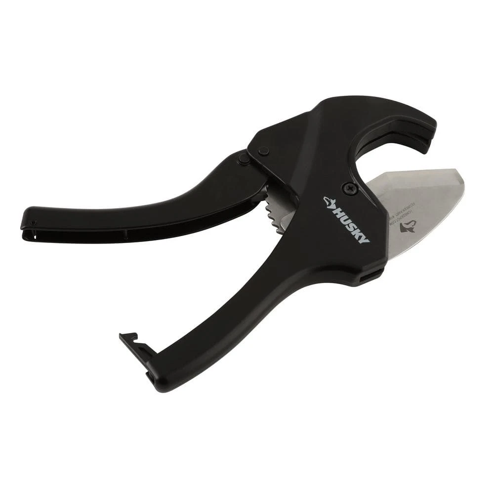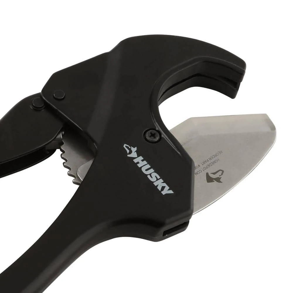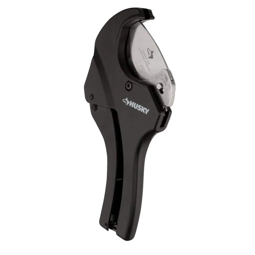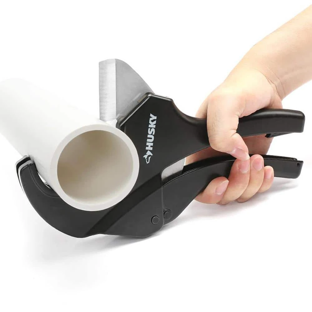 Husky’s 2 in. Quick Change Ratcheting Cutter tackles PVC, CPVC, Polypropylene pipe, PEX and Polyethylene pipe up to 2-3/8 in. outer diameter (2 in. inner diameter). The ratcheting action features quick change blade mechanism for added user convenience. Tool is covered by Husky lifetime warranty. Replaceable blade is available (SKU # 1003005272).