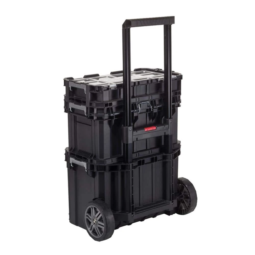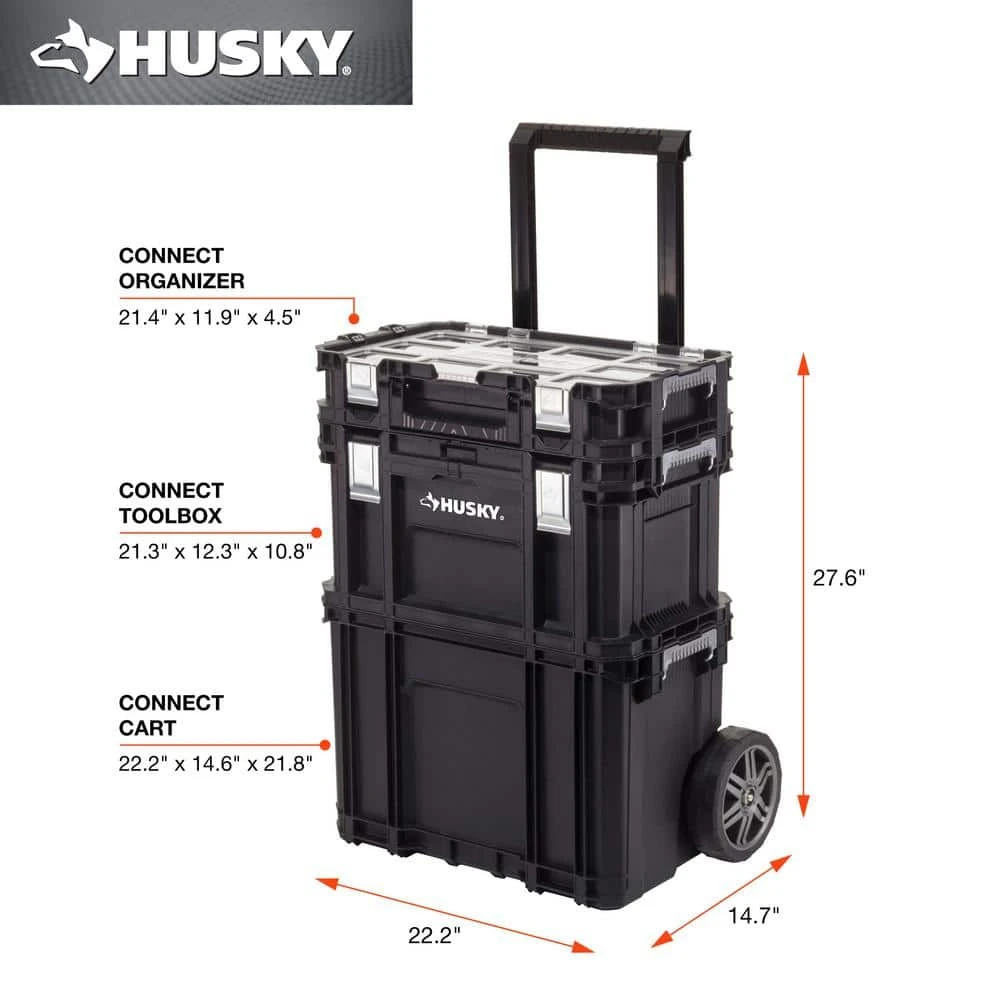 This 22 in. Connect System Rolling Cart features an interconnecting system allowing you to customize the way you transport your tools and accessories. The system features 3-Piece. A rolling cart, toolbox and small parts organizer. The rolling cart base is large for hauling power tools. The rolling cart features 7 in. rolling wheels and strong telescoping handle. The mid tool box is 22 in. W and features a flat lid surface to double as a work surface. The deep pro organizer features 12 removable bins.