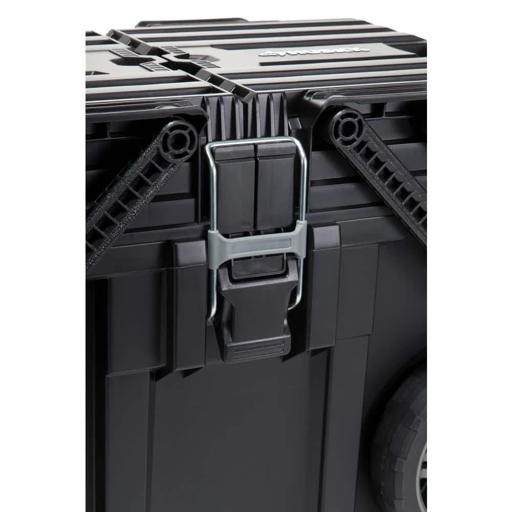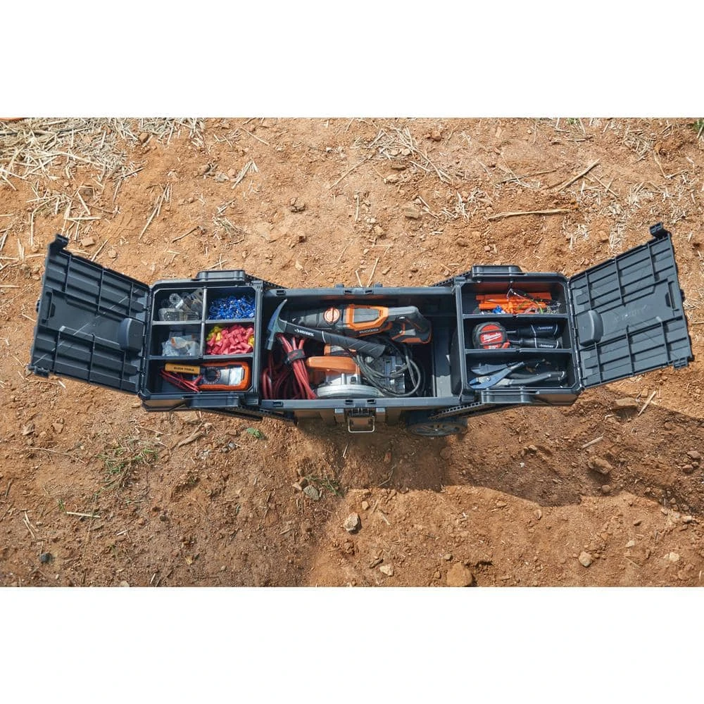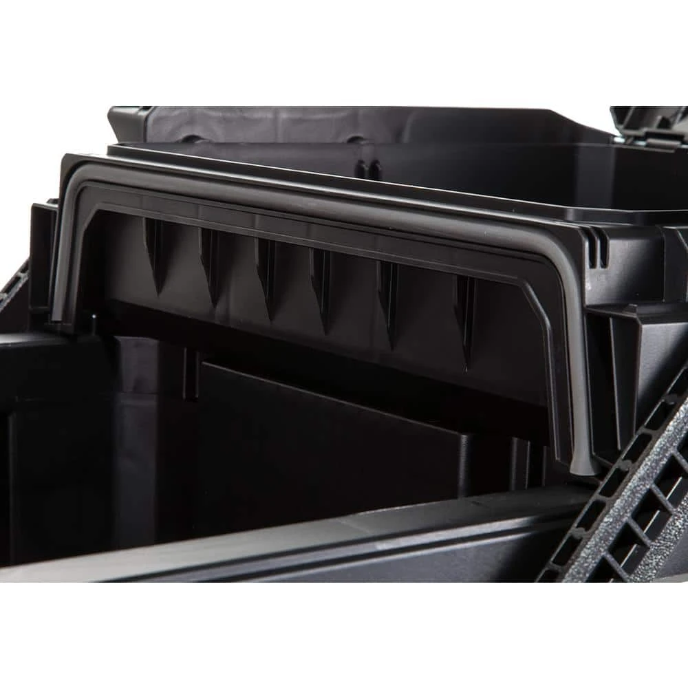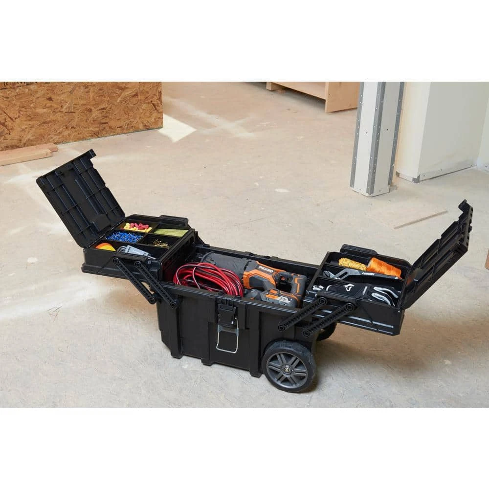 Introducing the New Husky 25 in. Cantilever Mobile Job Box. This Heavy-Duty mobile job box provides a unique way of organizing your tools and parts. The top lid area boasts an innovative cantilever lid that provides integrated organizers. There are 18 customizable compartments, holding your fasteners and small parts. The base unit has the capacity to accommodate your power tools. This well-designed tool box has 3465 cu. in. of total storage capacity for organizing and storing your tools and accessories. Large 8 in. all terrain wheels and extendable metal tubular handle makes this cart very mobile on any surface. The job box is also pad lockable.