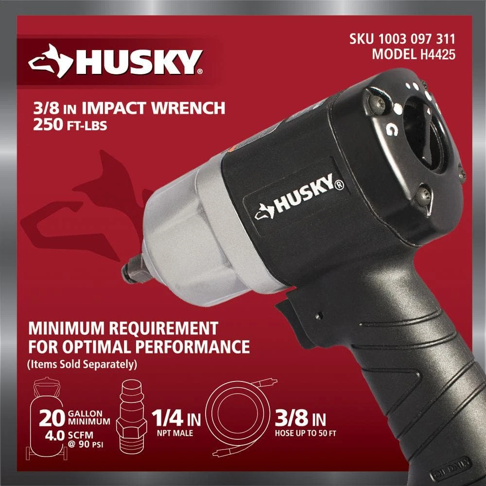 This 250 ft./lbs. 3/8 in. Impact Wrench is built for the professional user, providing more power with less noise. The tool features a low weight composite housing for added user comfort. Each tool produces 250 ft./lbs. of torque. Perfect for auto/recreational vehicle/garden equipment service and repair.