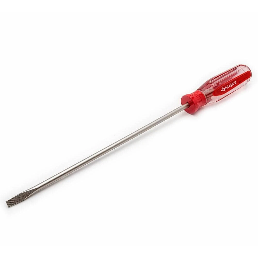 The Husky 3/16 in. x 8 in. Round Shaft Cabinet Tip Slotted Screwdriver features an impact and chemical resistant acetate handle. The forged steel blade is chrome plated for added corrosion resistance. The slotted tip is serrated which provides increased grip and reduces slipping to better avoid fastener rounding.