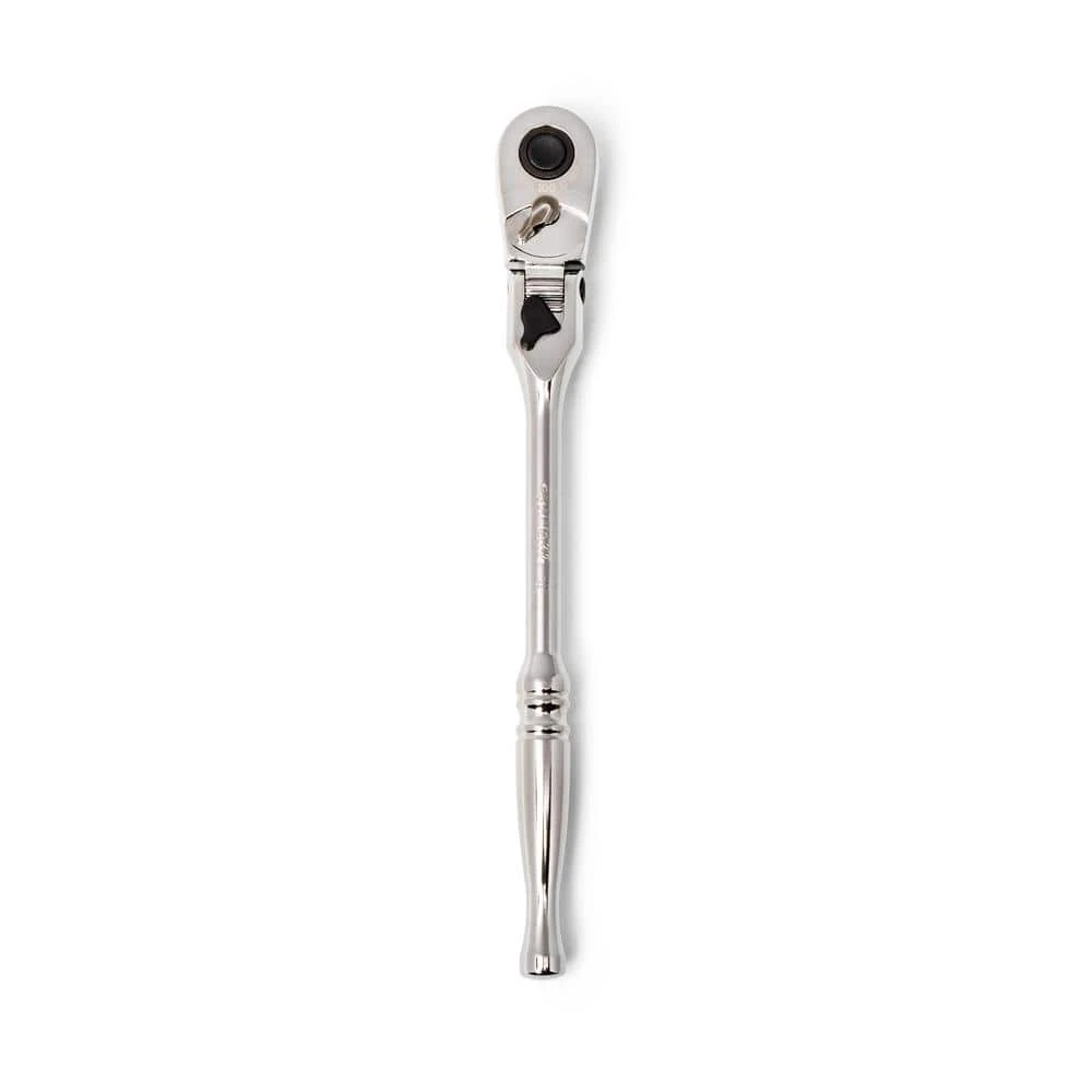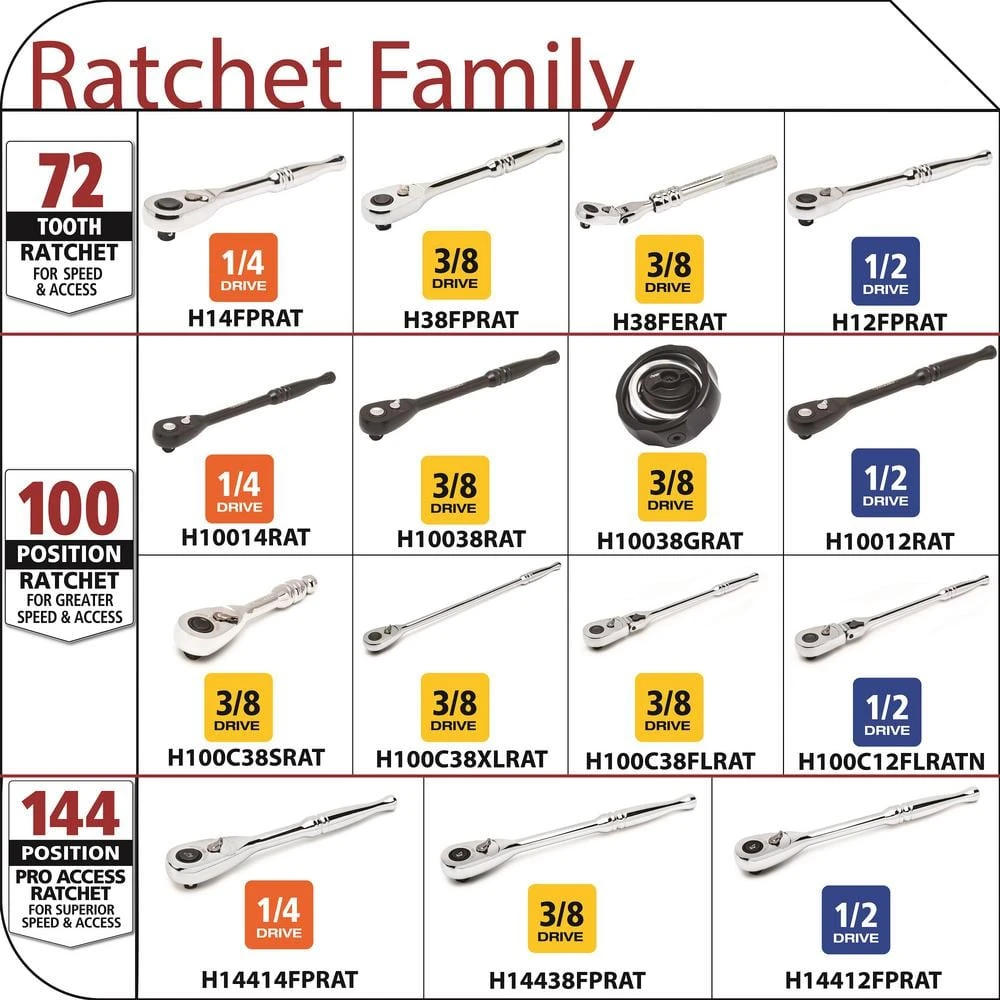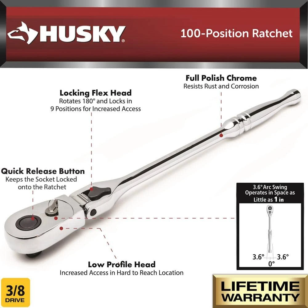 The Dual-Pawl technology of the New Husky 100-Position 3/8 in. drive ratchet provides access to turn fasteners where other ratchets can’t with it’s ultra-narrow 3.6° arch swing. Not only can the head flex to 7 different angles but it also has a locking trigger to hold head in place. It is 10% longer handle allows for increased reach to access hard reaching fasteners and improves overall leverage.