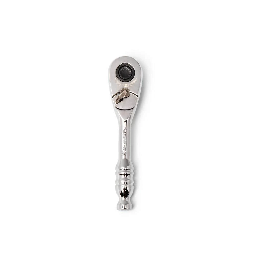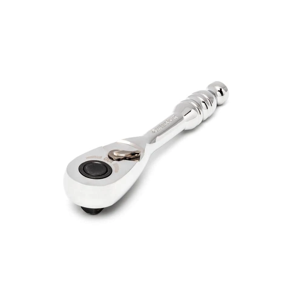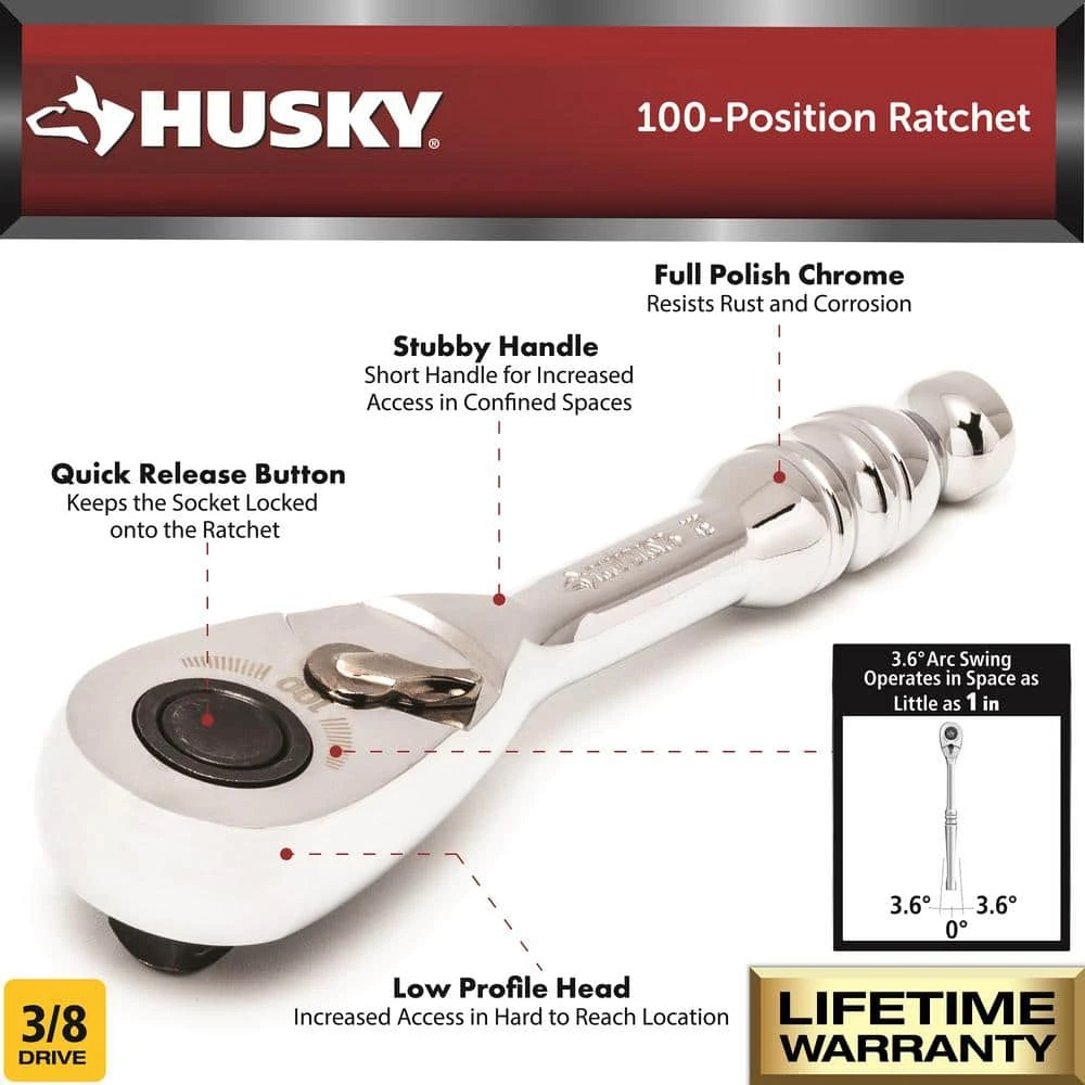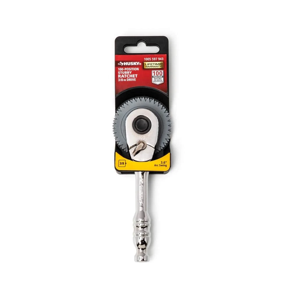 The dual-pawl technology of the Husky 100-position 3/8 in. drive stubby ratchet provides access to turn fasteners where other ratchets can’t with its ultra-narrow 3.6° arc swing. This ratchet has a low-profile, teardrop-style head to allow for excellent access to nuts and bolts. The chrome finish provides resistance to rust and corrosion.