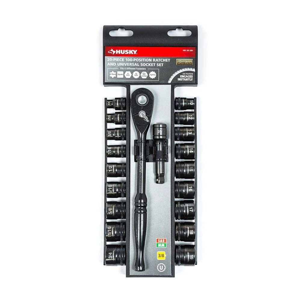 The dual-pawl technology of the 100-posiiton ratchet in this Husky 20-piece universal socket wrench set provide incredible access to blots and fasteners where other ratchets simply can’t. The 18 knurl grip universal sockets work on 6 different styles of fasteners, making this the ultimate socket set for any job. The Husky 20-piece 100-position universal socket wrench set is perfect for professional mechanics or the DIYer working around the house or in the garage needing access to hard-to-reach fasteners.