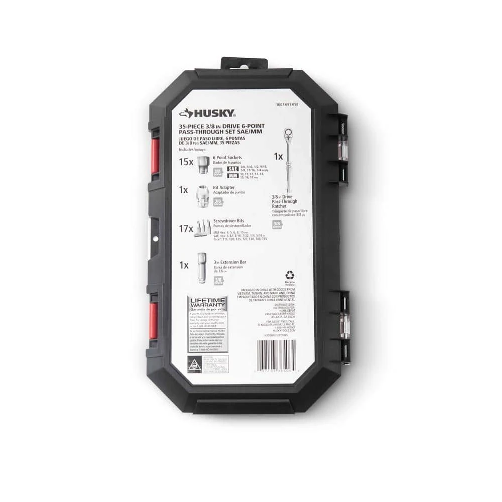 The innovative pass-through design of the Husky 35-Piece 3/8 in. Drive Pass-Through Socket Wrench Set allows this set to tackle jobs that standard socket sets just can’t. The hollow sockets and ratchet head enables threaded rods and bolts to pass completely through the tool for unbeatable access, virtually eliminating the need for deep sockets. The tool tray features a clear case and fits into most tool box drawers for a convenient storage solution. This set is a must-have for your home workshop and comes backed by Husky’s warranty for your peace of mind.