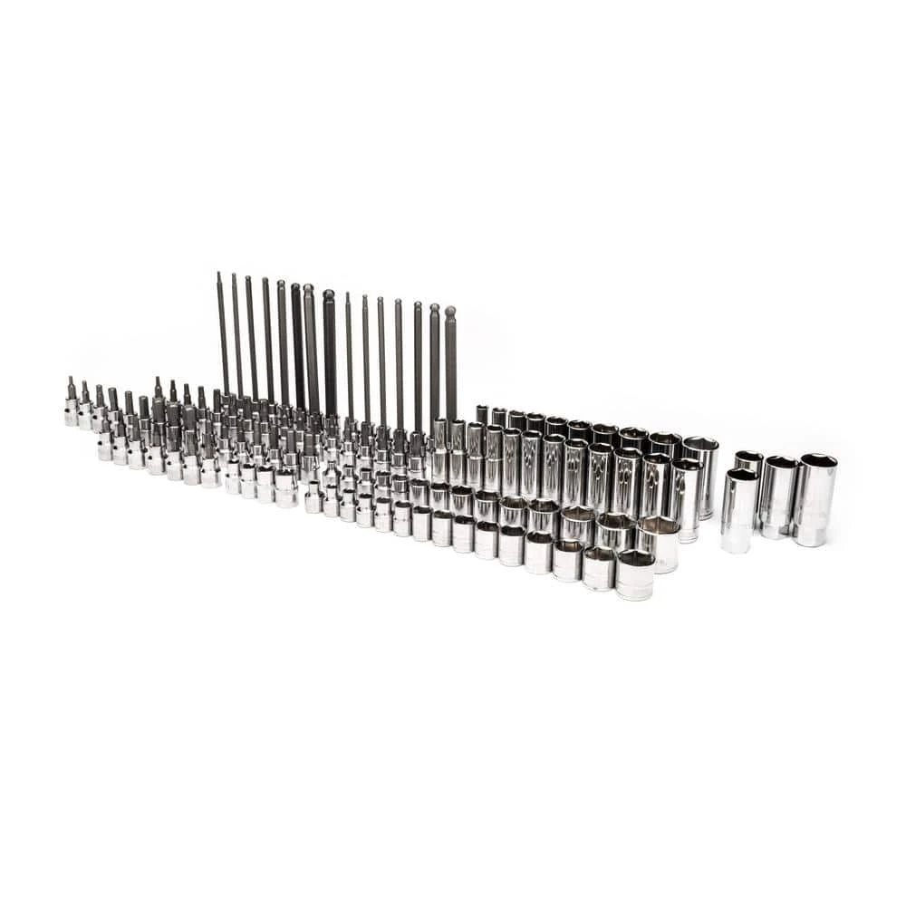 - Includes 29 standard sockets (5/32-1in. and 6-21mm), 22 deep sockets (5/16-7/8in. and 8-19mm), four spark plug sockets (5/8, 13/16, 3/4in. and 18mm), 55 bit sockets (Philips, Slotted, Hex 1/8-3/8in. and 3-12mm, Torx T15-T55) and four E-Torx sockets