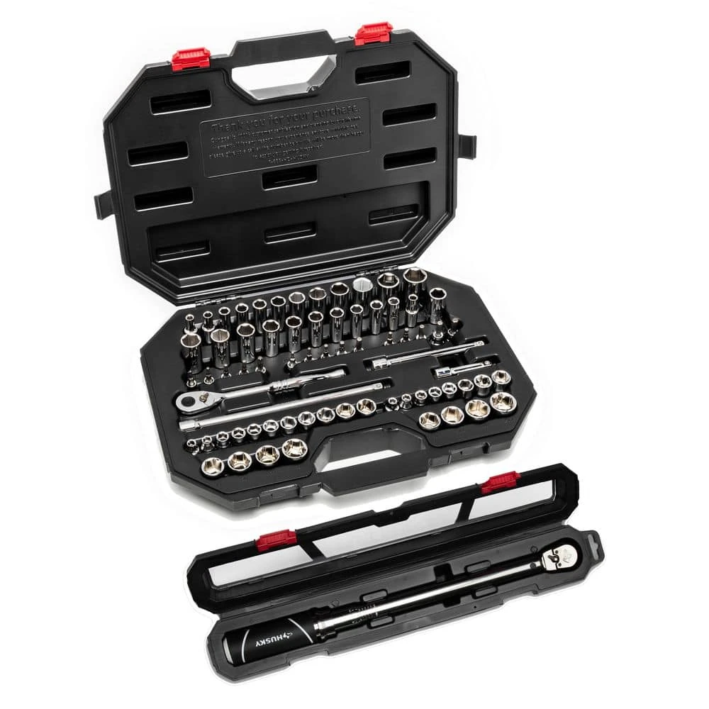 The 3/8 in. Drive Mechanics Tool Set with 3/8 in. Drive 20-100 ft./lbs. Torque Wrench includes a total of 71-pieces. With 66 different sockets forged from Chrome Alloy steel for outstanding durability and strength, you will be able to tackle a wide range of basic fastening or repair projects. The set also includes the 20 ft./lbs. to 100 ft./lbs. 3/8 in. Drive Torque Wrench. This Husky 71-piece set is ideal for any garage or your home workshop.