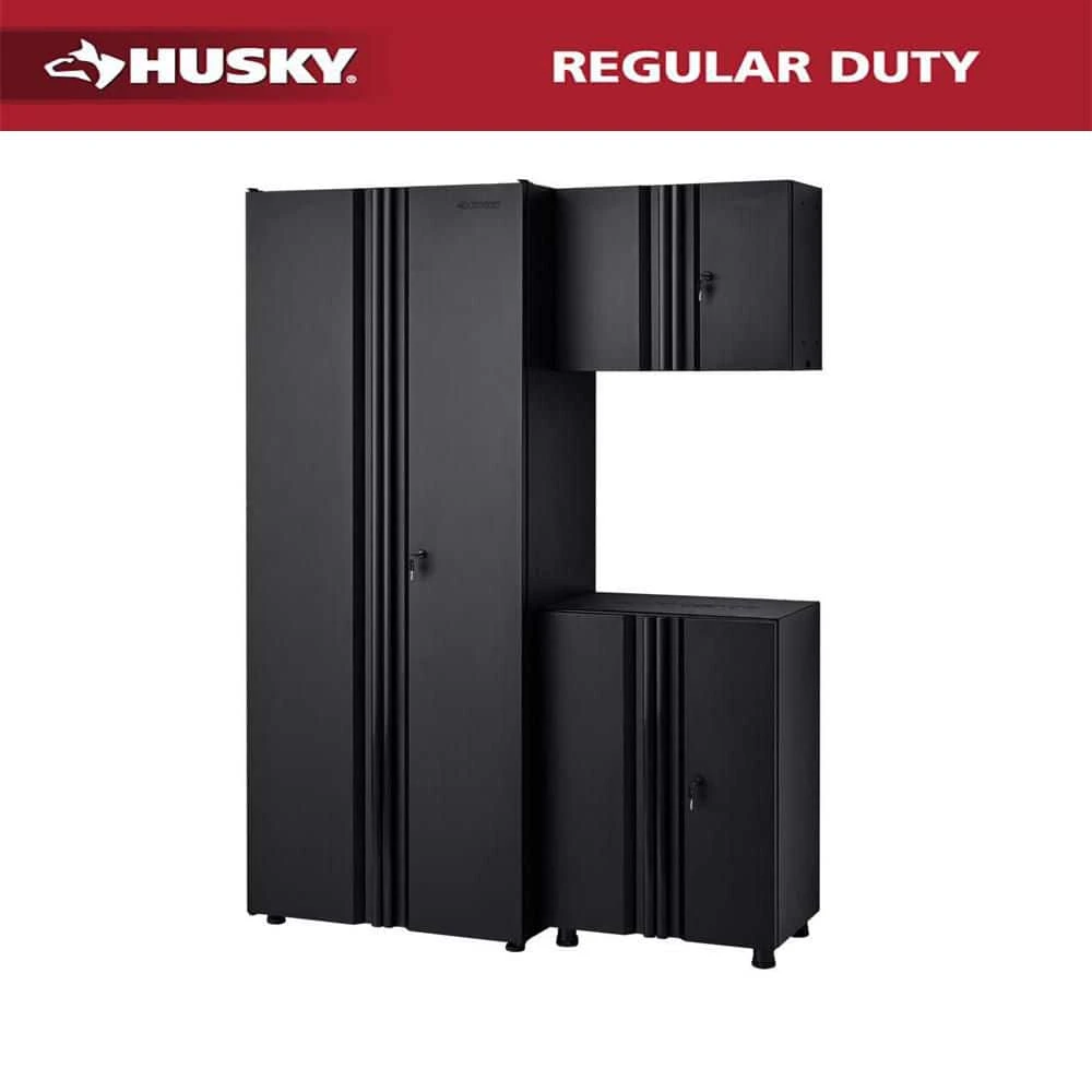 Organize your garage or workshop space with this Husky 3-Piece Regular Duty Welded Steel Garage Storage System in Black. With cord grommets, locks, adjustable shelves and an adjustable drawer, this set has plenty of space to store your tools. The drawers have ball-bearing slides so they ft. re easy to open and close. The best part is it comes preassembled, so installation is easy.