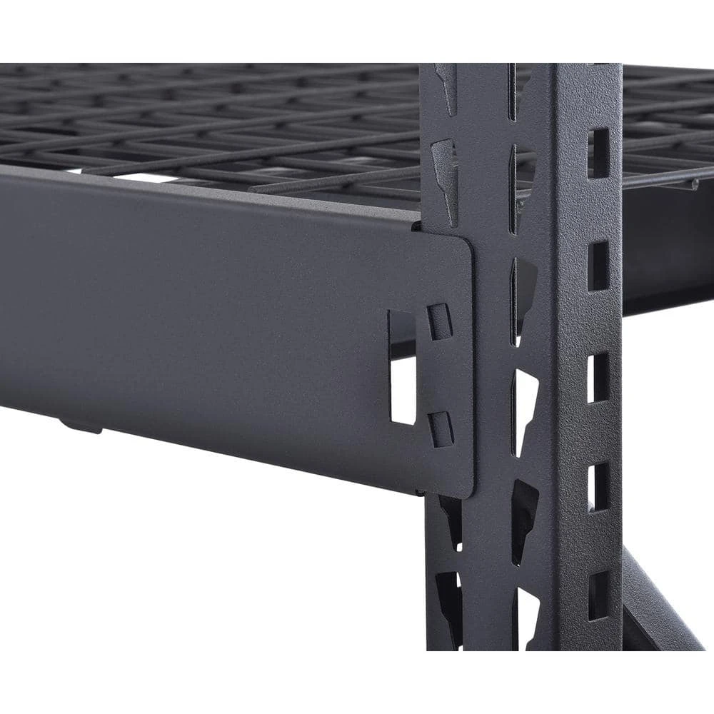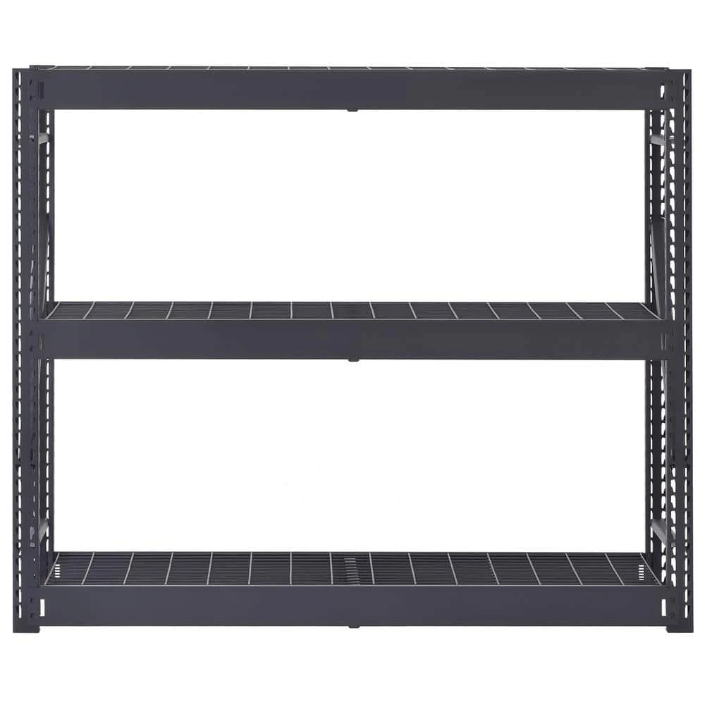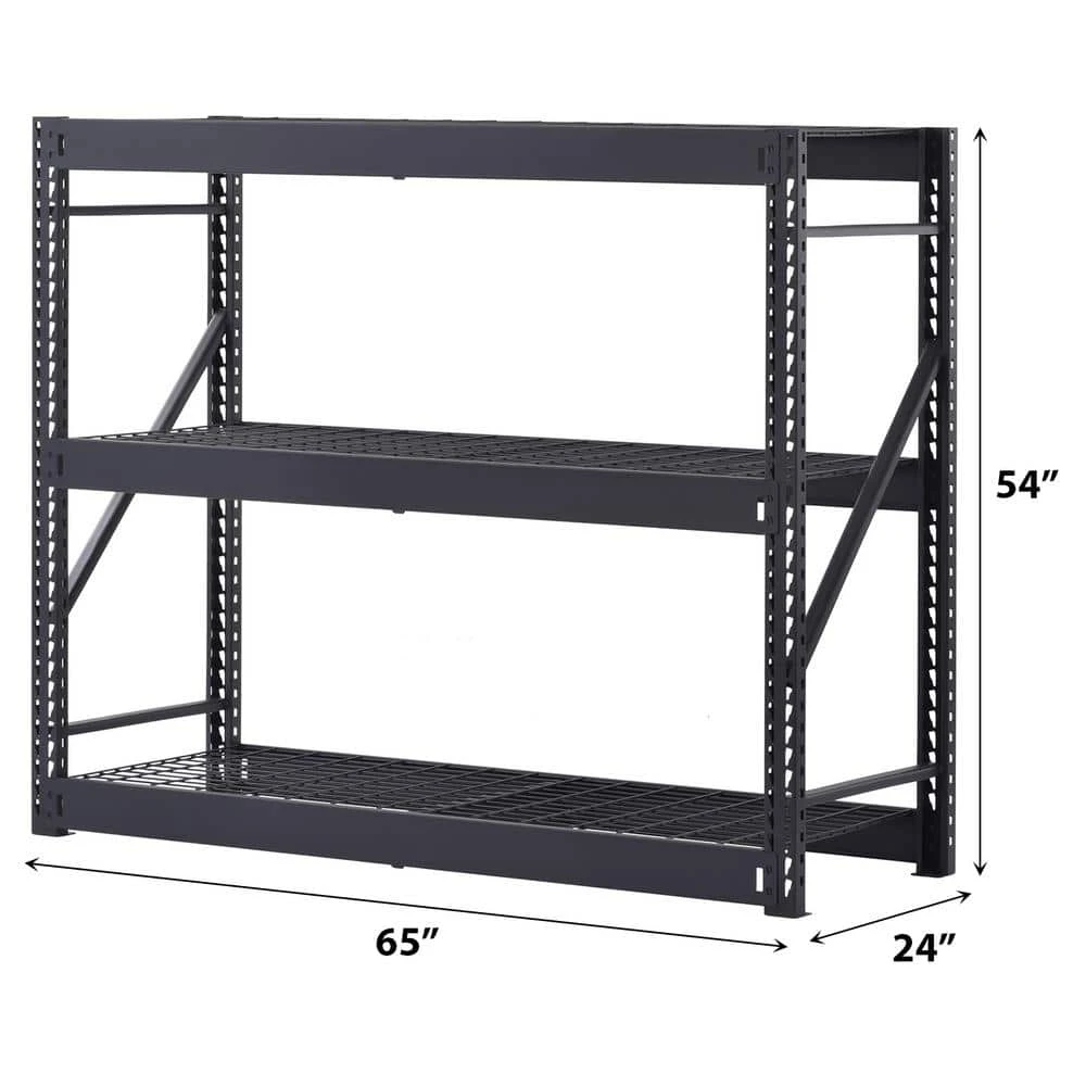 Perfect for organizing your garage or workshop, Husky’s Welded Frame Shelving Unit measures 54 in. H x 65 in. W x 24 in. D. The 3 adjustable wire shelves provide ample storage space to accommodate a variety of heavy items, each shelf supporting up to 2500 lbs. This unit is constructed with steel in a textured finish for durability and strength. Bolt-free and easy to assemble.