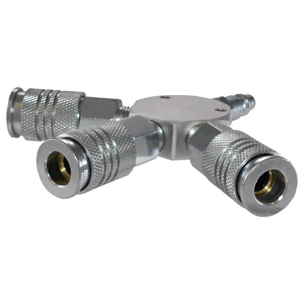 This 3-Way Manifold is designed to split a single airline from an air compressor into 3 separate airlines. Each inlet connects to 1/4 in. industrial (I/M) couplers while the 3 outlets connect to 1/4 in. industrial (I/M) and automotive (T) plugs. Made from steel and aluminum for added durability.