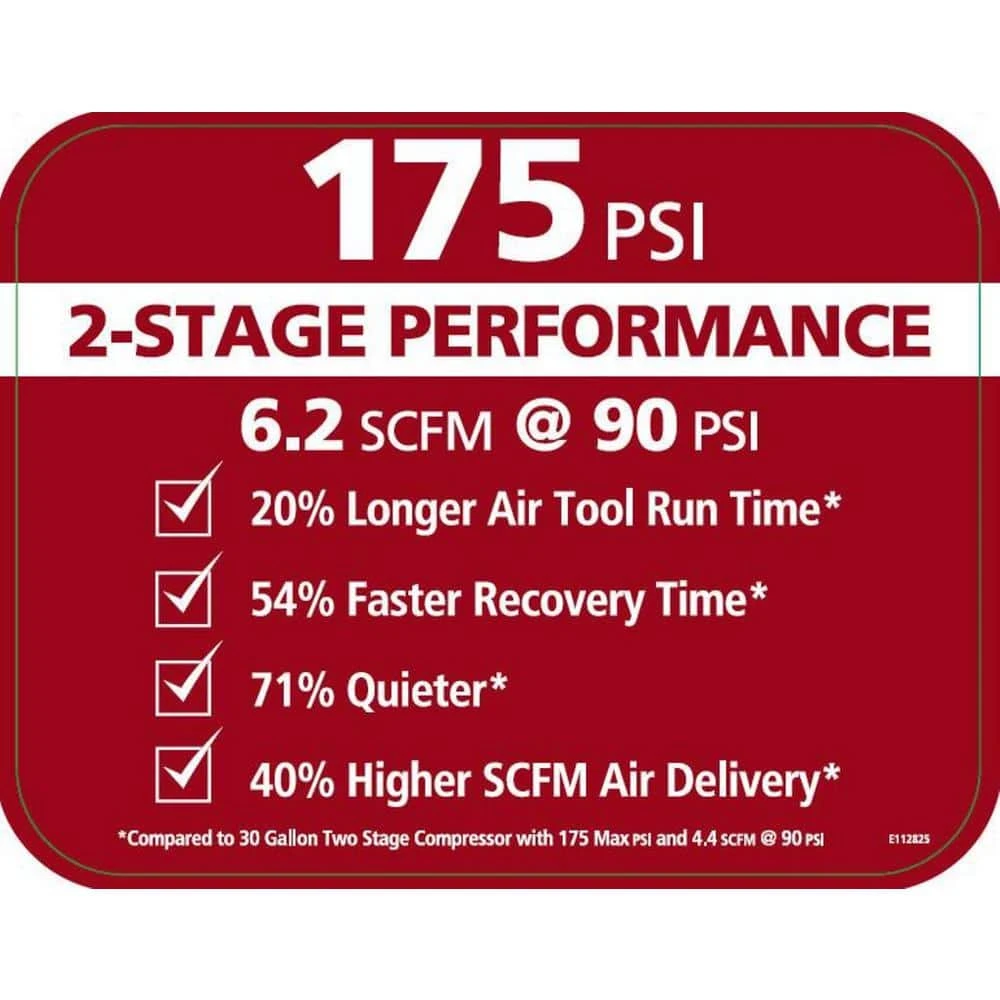 - 20% longer air tool run time compared to 30 gallon 2 Stage compressors with 175 PSI and 4.4 CFM at 90 PSI