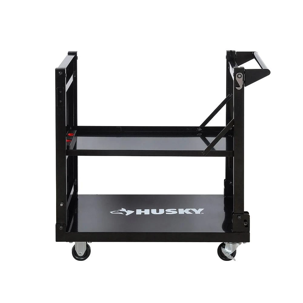 The Husky Folding Utility Cart is made of heavy-duty powder coated steel with a weight load capacity of 300 lbs. It has ample storage space with 3-shelves, up to 3-working positions and is ideal for working in virtually any environment such as garages, workshops, offices, etc. Each storage shelf can hold up to 100 lbs. The Husky Folding Utility Cart is also ideal for easy transporting and easily folds up for compact storage. When in use, the cart can be moved very easily by using the 4 heavy-duty casters (2 lockable), which are included. When not in use, it can be folded and stored in a small, compact area, such as a vehicle, closet, garage, etc.