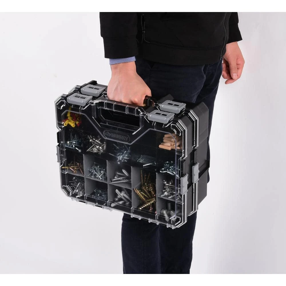 The Husky 2-Pack Interlocking Organizer is ideal for storing hardware and small parts as well as bringing your projects on-the-go. The removable dividers enable custom storage, a great way to make sure each small part has enough room within the organizer. These organizers come in a pack of 2 and can be easily interlocked together, with a maximum of 3 organizers. To lock/unlock the organizer, slide the locking mechanism on the side in order to lock the organizers together or unlock them. The removable dividers make the organizer easy to customize, allowing you to fit large parts or pieces by removing more dividers or fit many small items in the designed divider spots. Designed with heavy-duty construction for extra strength and durability, allowing you to organize your parts for a long time. This Husky 2-Pack Interlocking Organizer is perfect for anyone that has various parts and pieces that need to be organized. This set is perfect for frequent craft hobbyist as a way of storing and organizing small items.
