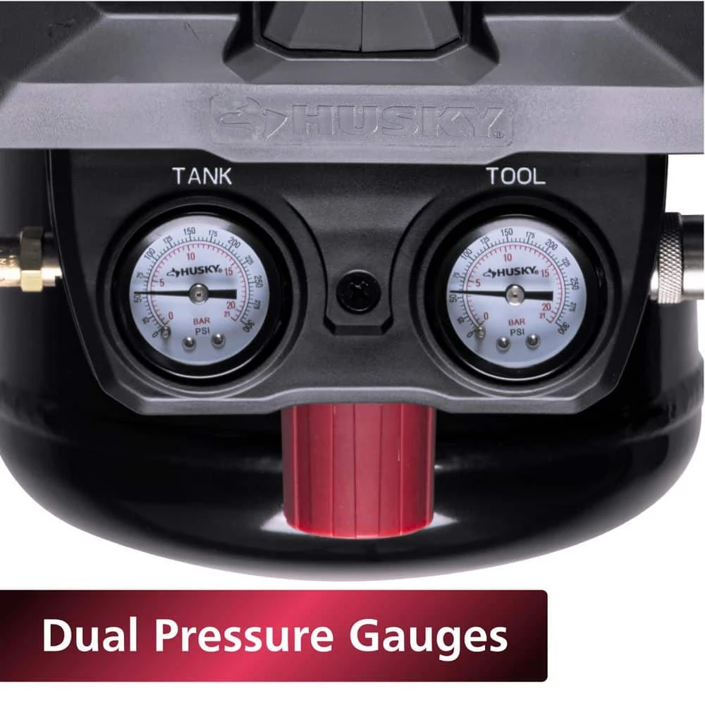 - Dual Gauges: Allow easy monitoring of tank and tool pressure, providing precise control for optimal operation and enhanced accuracy during demanding jobs with clear, reliable readings.