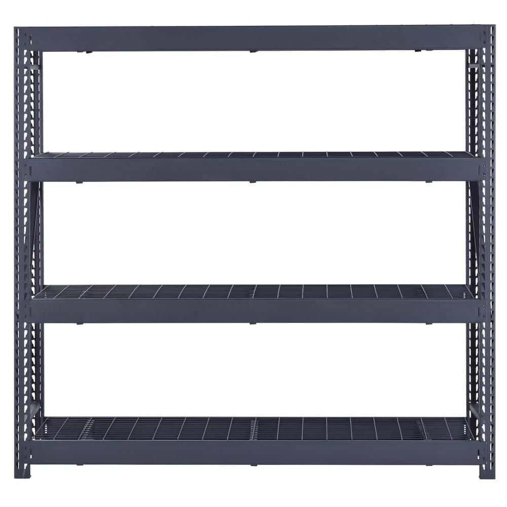 Perfect for organizing your garage or workshop, Husky’s Welded Frame Shelving Unit measures 72 in. H x 77 in. W x 24 in. D. The 4 adjustable wire shelves provide ample storage space to accommodate a variety of heavy items, each shelf supporting up to 2500 lbs. This unit is constructed with steel in a textured finish for durability and strength. Boltless design for easy assembly.