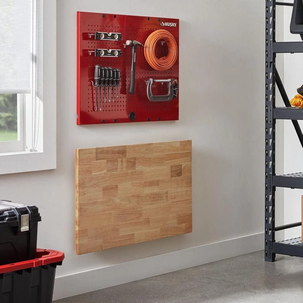 The ideal solution for smaller spaces where a bench is needed, this folding workbench easily lifts into the raised position, where heavy-duty steel brackets lock into place for a 400 lbs. of evenly distributed weight rating (properly installed). When not in use, it is easy to fold by pressing the release tabs with fingertip pressure and hangs flat against the wall to regain your space. The wood worktop provides premium work surface for various works.